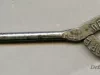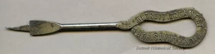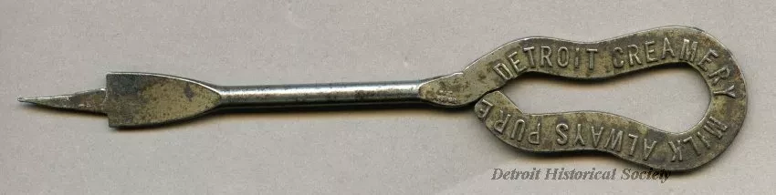 One puncture-type can opener from the Detroit Creamery Company. The opener is made of stamped steel with a flat, irregular oval-shaped handle, a round shaft, and a sharp, flat point at the tool end. The handle has a decorative raised design on one side and raised text on the other side that reads "Detroit Creamery, Milk Always Pure," and "Pat. Apd. For." The pointed end has stamped text on both sides that reads "Pat. Ap. Fo. [Patent Applied For]."