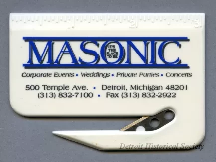 One pocket-size letter opener which advertises the Masonic Temple of Detroit. The rectangular opener is made of thin white plastic and has a 3-inch ruler along the top edge. The bottom edge has a tapered point with a groove above it. A small steel blade is mounted in the plastic at the inner end of the groove. Black and blue text is printed on one of the side of the opener (between the ruler and the groove) that reads "Masonic - It's The Place To Be," and "Corporate Events - Weddings - Private Parties - Concerts." Additional black printed text reads "500 Temple Ave., Detroit, Michigan 48201," and "313-832-7100, Fax 313-822-2922." Small raised text on the back of the opener reads "Pat. D 353,316," and "ASI #75650-RL, Taiwan."