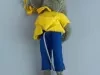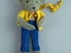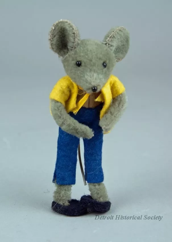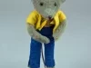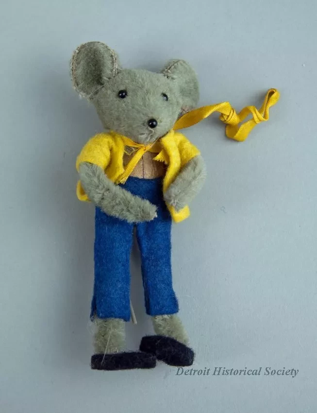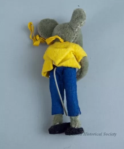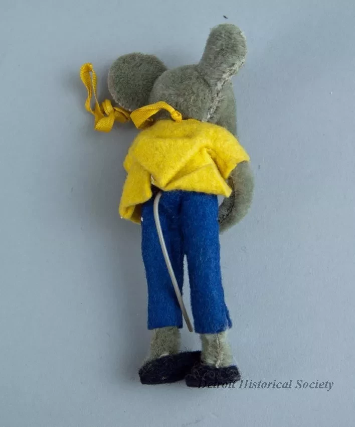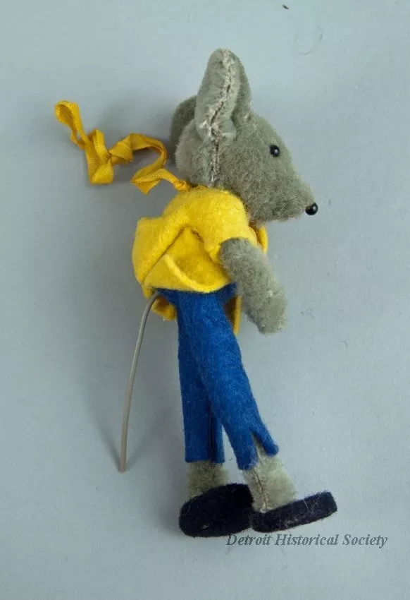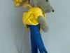 Christmas tree ornament: Gray felt mouse wearing yellow jacket, blue pants, and black shoes. Has black plastic beads for eyes and nose with a gray plastic tail.