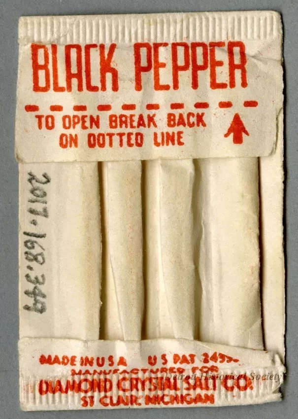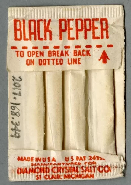 One single-serving packet of black pepper from the dining room of the cruise ship, SS Aquarama. The rectangular paper packet consists of four small paper tubes of pepper and a tear-off top. Red printed text on the tube side reads "Black Pepper" with opening directions. Small red printed text along the edge shows the manufacturer's name, "Diamond Crystal Salt Co." The other side of the packet has large red script text that reads "Aquarama."