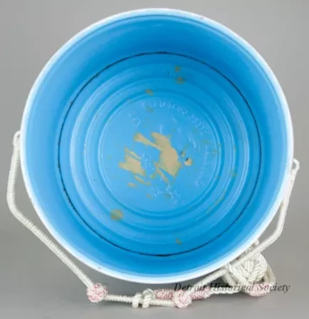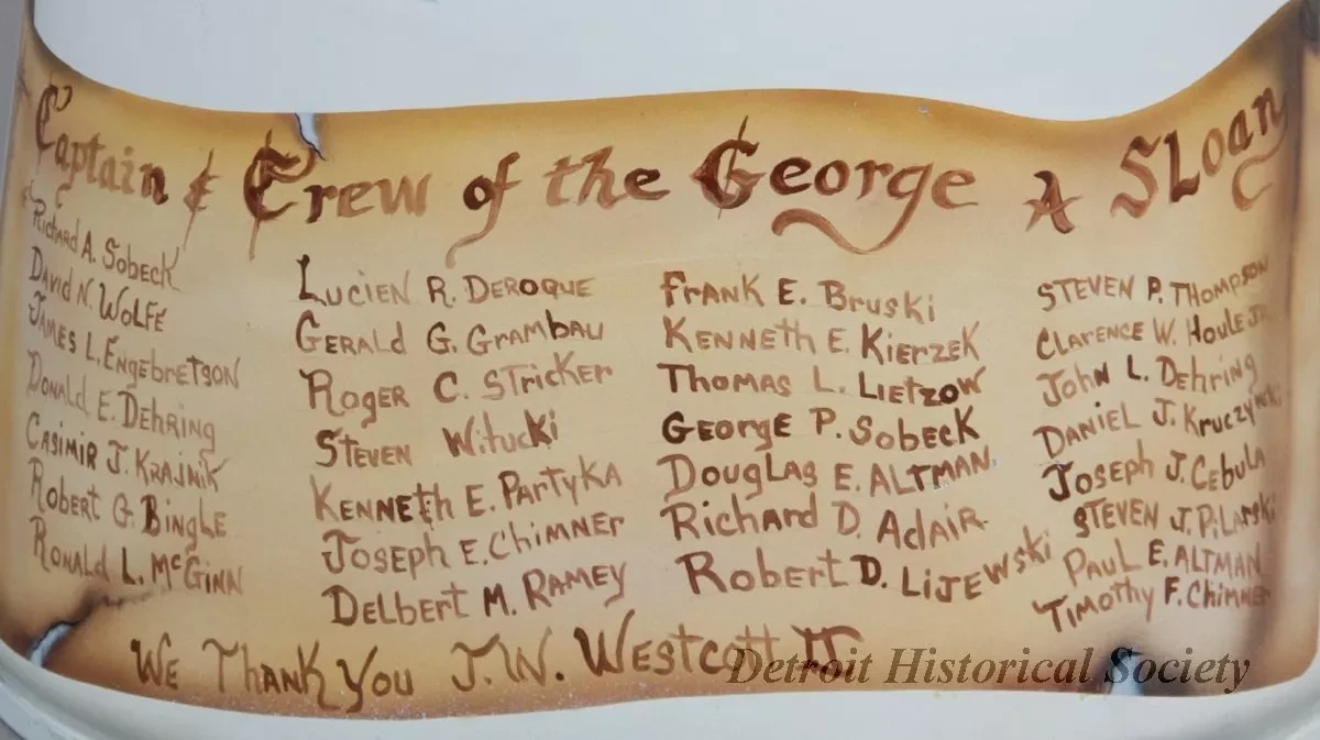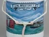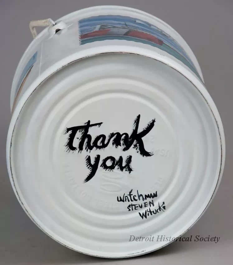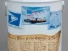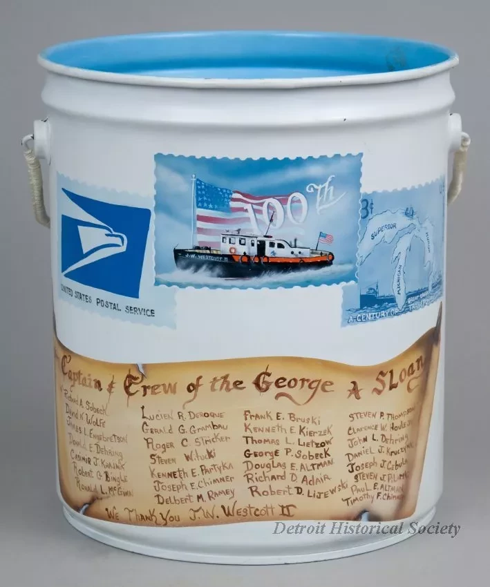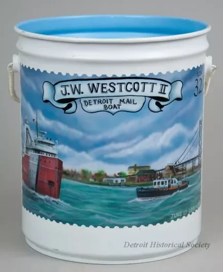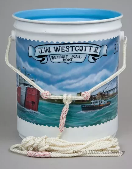 One 5-gallon steel pail that was specially hand-painted to celebrate the 100th anniversary of the incorporation of the mail boat operator, J.W. Westcott Company, of Detroit. The exterior has been painted white and the interior is light blue. The exterior front side features a color painting of the self-unloader, SS George A. Sloan, and the mail boat, J. W. Westcott II, on the Detroit River with the Ambassador Bridge in the background. Painted text at the top reads "J.W. Westcott II, Detroit Mail Boat." Small painted text in the lower right corner reads "June 17, 1895 to 1995." The opposite side of the pail has three images of postage stamps which depict a U. S. Post office emblem, a port side view of the J. W. Westcott II, and a 3¢ postage stamp with an outline map of the Great Lakes. Beneath the stamp images is a painted scroll that lists all of the crewmember names of the SS George A. Sloan. The pail artist, Steven Witucki, was a crewmember aboard the Sloan and has signed his name in black paint on the bottom: "Thank You, Watchman, Steven Witucki." The pail handle is covered with decorative braided white nylon cord and has two small Turk's head knots. In addition, a length of white nylon rope (3-strand, 1/4-inch diameter, approximately 25 feet long) is attached to the handle. A blue satin "First Award" ribbon is also included.