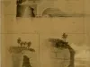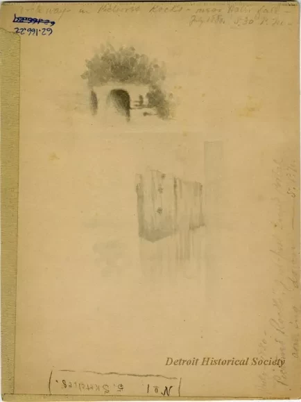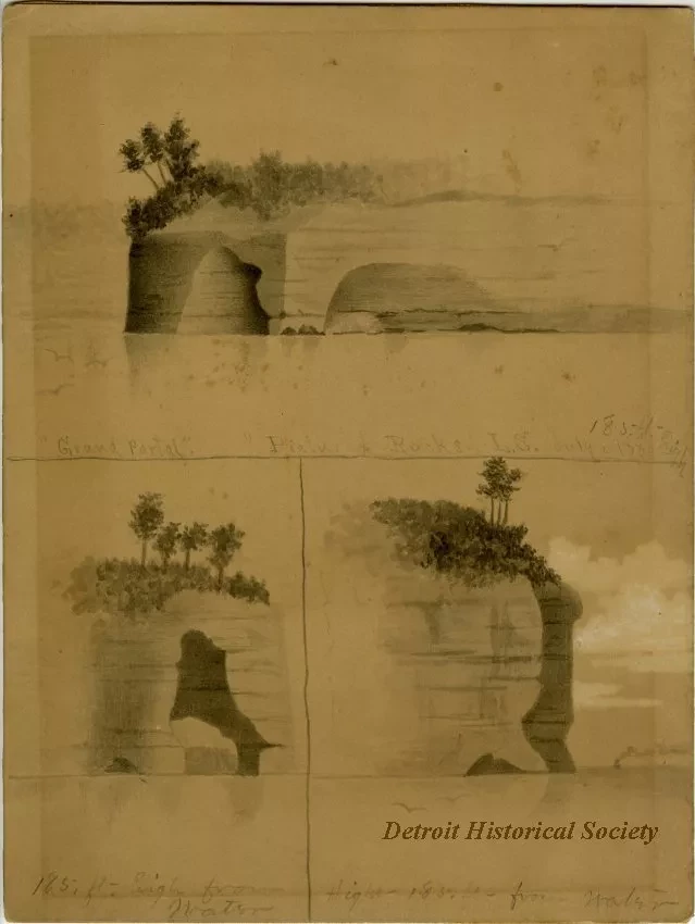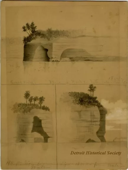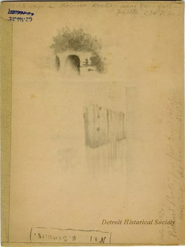Five small watercolor landscape painting by Frank C. Bracy of Lake Superior's Pictured Rocks, on a single sheet of cardstock. Three views are on the recto, and two are on the verso. Grand Portal is depicted from three different angles on the recto, with the caption, "'Grand Portal', 'Pictured Rocks,' L.S. July, 1880, 185 ft. high." The paintings on the verso are labeled, "Archway in Pictured Rocks, near waterfall, July 1880, 5:30 P.M.," and "July 1880, 'Pictured Rocks,' just past Grand Portal coming down, 5 P.M." "No. 1 5 sketches," is also handwritten on the verso.