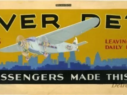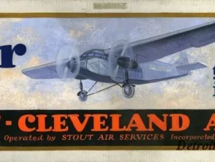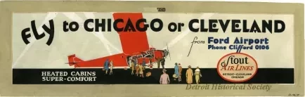 Original painted sample artwork from Walker & Co. for a Stout Air Lines advertisement. The advertisement shows a right side profile view of a red Ford Tri-Motor airplane with 14 people shown boarding the plane. Text at top reads "Fly to Chicago or Cleveland from Ford Airport Phone Clifford 0106." Text at bottom left reads "Heated Cabins Super - Comfort." The Stout Air Lines logo is at the bottom right. A sticker on the back reads indicates that it is Walker & Co. Sketch No. 6731.