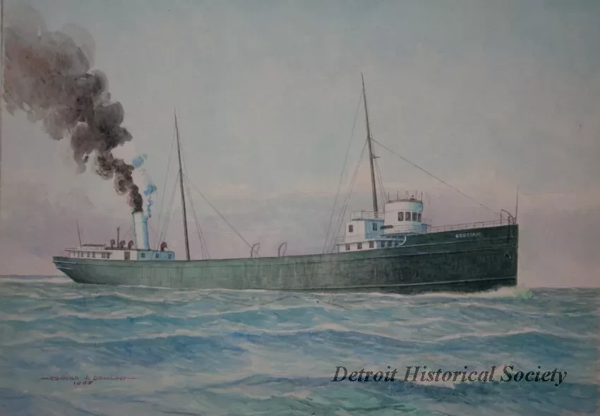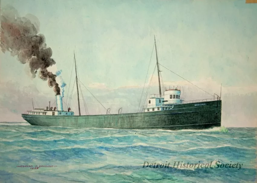 One watercolor painting of the bulk carrier steamship, GRECIAN, 1891, of the Pittsburgh Steamship Company. The painting shows a starboard side view of the freighter, which has a dark green hull, and is underway in fair weather. The artist has signed his name, "Edward J. Dowling, 1965," at the lower left corner of the painting. Un framed.