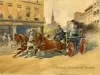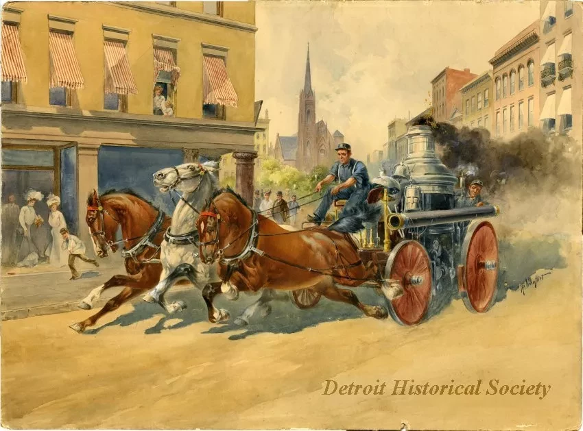 Watercolor painting on paperboard by Richard Veenfliet of a team of three horses pulling an early fire engine. Two firefighters in blue uniforms ride on the engine. Several spectators watch from the sidewalk around and the windows of a building on the left. A group of trees in front of a church are in the background at the center.