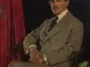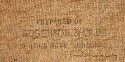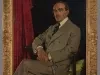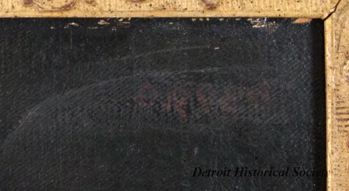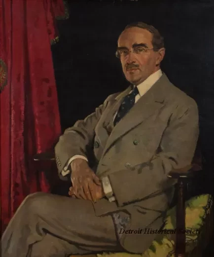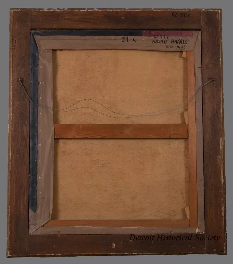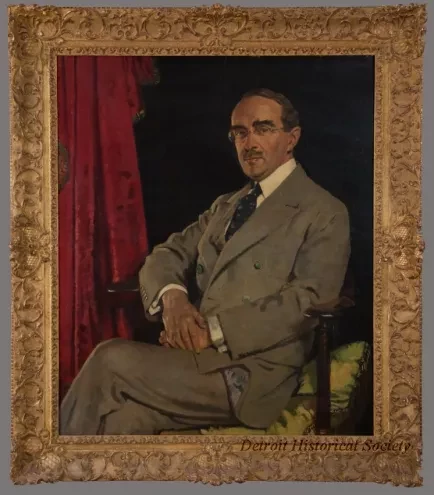 One portrait of Julian Hartwell Harris (1876-1933), painted in 1928 by English artist Sir William Orpen. The oil painting on canvas shows the subject seated with his left leg crossed over the right and his right arm resting on a table. He has brown hair, a small mustache, is wearing rimless glasses, and is wearing a grey double-breasted suit with a blue tie. The painting has a dark background with a red drape on left. The artist has signed his name, "Orpen," in the upper right corner. Black printed text on the back of the canvas reads "Prepared By Roberson & Co., Ltd., 9 Long Acre, London." The painting is mounted in an ornate wood frame which has a gilt finish.