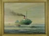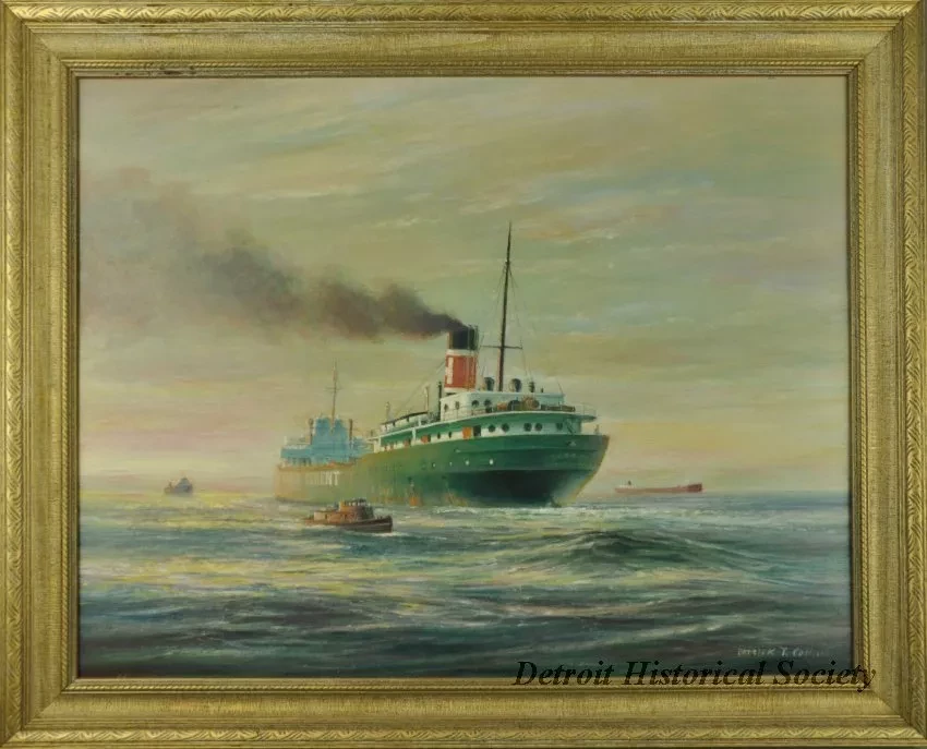 One framed oil painting on board of the Huron Portland Cement Company steamship, S. T. Crapo. The painting shows a view of the stern and port side of the steamship while it is underway in fair weather. A small tugboat is visible in the foreground and two freighters can be seen in the background. The artist, Patrick T. Collins, has signed the painting in the lower right corner. The wood frame has light decorative carvings and is finished in a muted gold color.