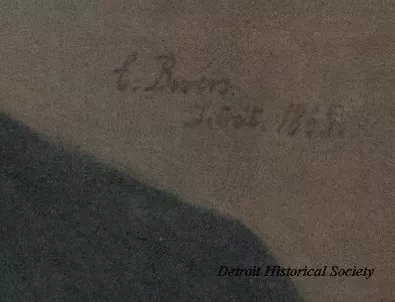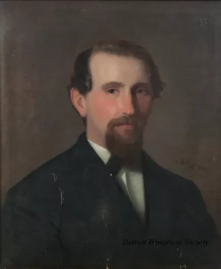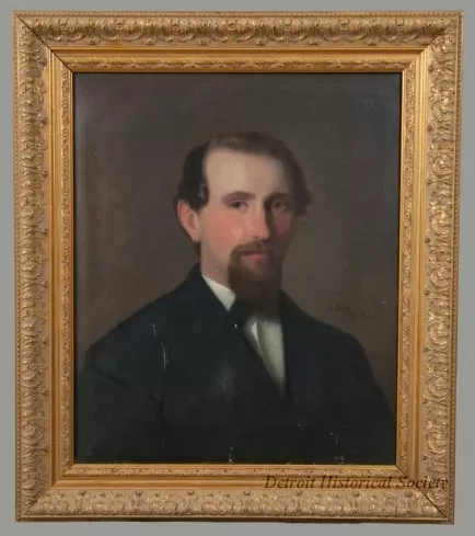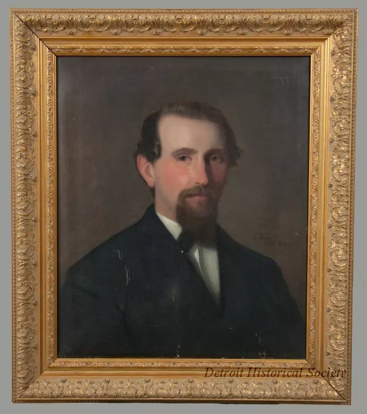 One framed oil painting on canvas of Detroit businessman, Joseph Dominick Perrien (1833-1896). The painting shows a head and shoulders portrait of the subject who is wearing a white shirt with a dark-colored bow tie and coat. The artist has signed his name "E. [Edward] Bowers, Detroit, 1865," near the right shoulder of the subject. The painting is held in a decorative gold-colored wood frame.