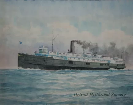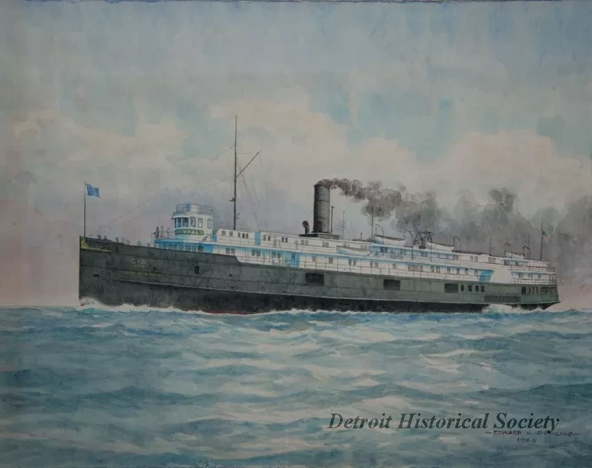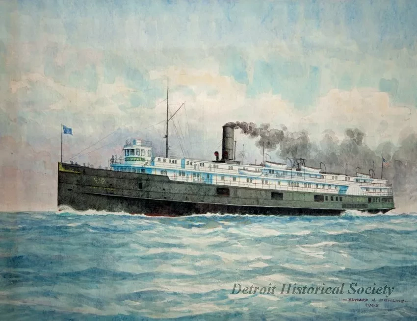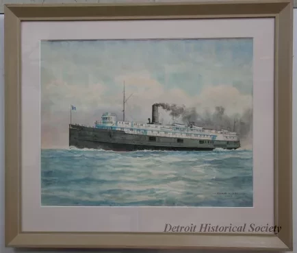 One watercolor painting of the passenger steamship, CITY OF BUFFALO, of the Cleveland & Buffalo Transit Company. The painting shows a port side view of the ship which is underway in fair weather. The artist has signed his name, "Edward J. Dowling, 1965," near the lower right corner. The painting is mounted in a lime oak wood frame with a light gray matte border and protective glass.