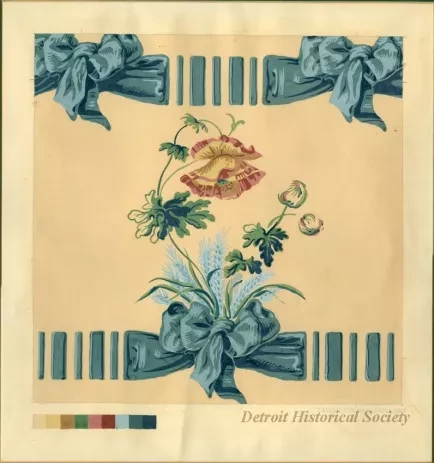 Color painting on paper, mounted on board and matted with green board, showing a wallpaper design by Francis Geck. The design shown features blue ribbon, tied into bows, and a yellow and pink flower. A 9 color palette, showing the colors used in the design, is on the bottom left.