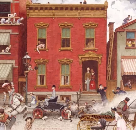 Watercolor painting on illustration board; white frame; shows Henry Ford driving a 1903 Model A on a typical Detroit brick street; forty-one people are watching Mr. Ford from various windows, roof tops, lamp poles, and along the street, with several children chasing behind the car; a horse at the right of the picture is rearing back frightened by the car. May also contain charcoal or ink. Originally 1 of a set of 5, done as part of Ford's 50th anniversary celebration. Two remain in the Ford archives and it is thought that the other 2 burnt in the fire that destroyed the Ford Rotunda. They were issued as prints and as a calendar.