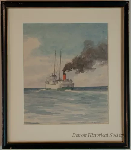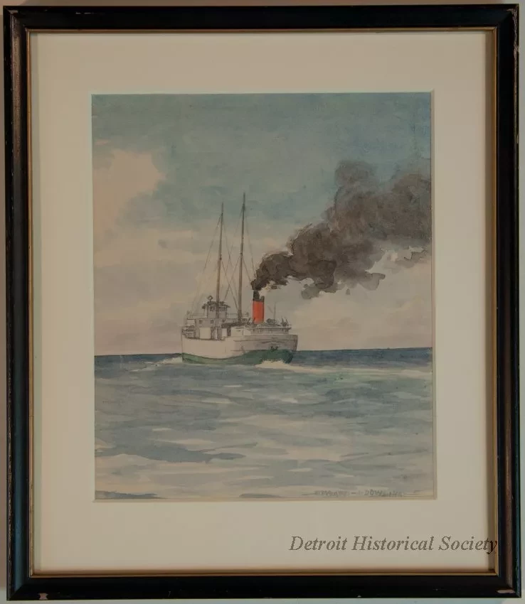 One watercolor painting of the steamer, W.W. ATTERBURY. The painting shows a port quarter view of the ship which is underway in fair weather. The ship has a white hull with a green underbody below the waterline. The stack is orange with a black top and shows lots of smoke. The two tall spars are brown. Small whitecaps are visible on the water in the foreground with a blue/white sky in the background. The artist has signed his name, "Edward J. Dowling, 1933," in the lower right corner. The painting is held in a black wood frame with a white matte and protective glass.