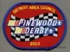 One commemorative patch for the Boy Scouts of America "Detroit Area Council, Pinewood Derby, 2003." The oval-shaped patch has yellow and white text, a red background, and a narrow serged border of blue thread. The center of the patch shows multicolor embroidered images of a racing flag, racing stripes, and two small white emblems of the Boy Scouts of America. The back has a clear, heat-activated adhesive coating.
