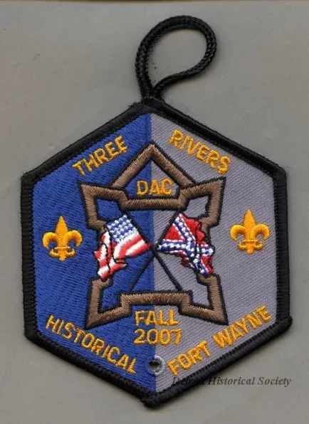 One commemorative patch for the Boy Scouts of America "Three Rivers DAC, Historical Fort Wayne, Fall, 2007." The hexagonal-shaped patch has yellow text, a blue/gray background, a narrow serged border of black thread, and a black thread loop at the top. The center of the patch shows multicolor embroidered images of the outline of a fort, crossed USA and Confederate flags, and two small yellow emblems of the Boy Scouts of America. The back has a clear, heat-activated adhesive coating.