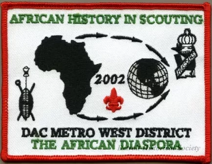 One commemorative patch for "African History in Scouting" from the "DAC Metro West District, the African Diaspora." The rectangular patch has green and black text, a white background, and a narrow serged border of red thread. The center of the patch shows black embroidered images of the African continent, a shield, arrows, and a world globe as well as the red emblem of the Boy Scouts of America. The back has a heat-activated adhesive layer.