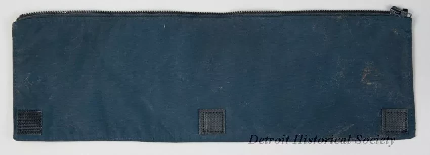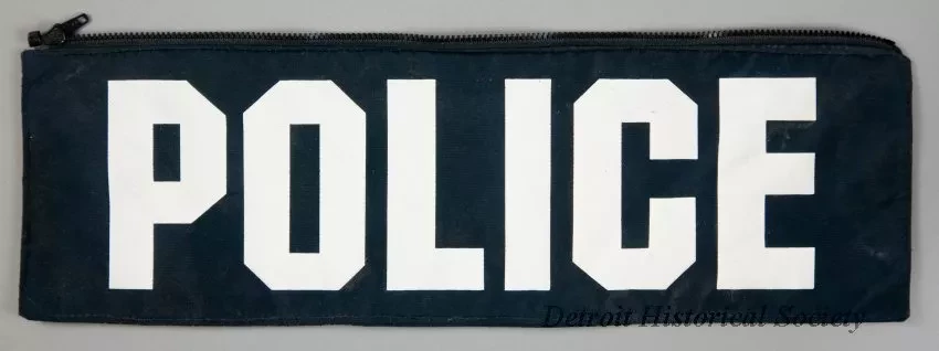 One "POLICE" uniform identification patch that was used by the Wayne State University Police department. The removable patch is made of black nylon fabric with large white block lettering on one side that reads "POLICE." The bottom and side edges have sewn seams and the top edge has a black zipper. Three Velcro squares are sewn along the lower edge on the back of the patch. No manufacturer's labels are shown.