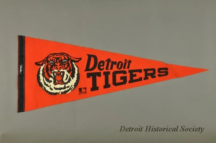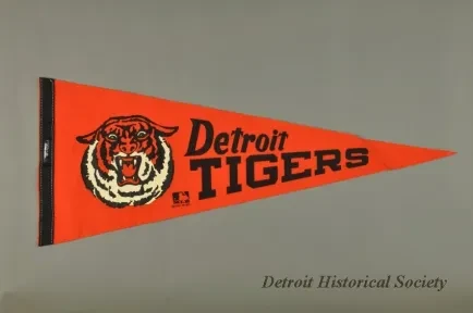 1 pennant: orange with black 1" strip on left side; decor in black and white tiger face; "Detroit Tigers" printed in black;