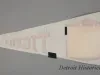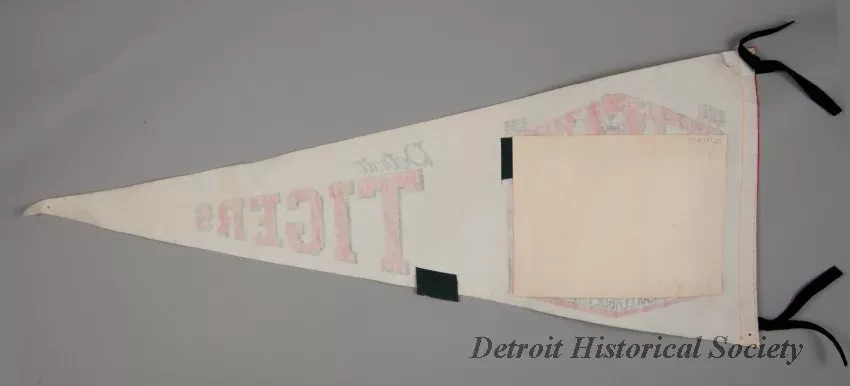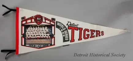 One "World Series, 1968, Detroit Tigers" pennant. The triangular pennant is made of white felt with black/orange lettering. It has a rectangular cutout area on the left side which has a color photographic image of the Detroit Tigers baseball team glued into the opening. The cutout is framed by a simple black/orange outline drawing of Tiger Stadium that has an image of a tiger at the top and black printed text at the bottom that reads "American League Champions." A curved green strip of green felt it located to the right of the photograph which has white printed text that reads "World Series, 1968." The left edge of the pennant has a strip of orange felt and two pairs of black felt ties at each corner.