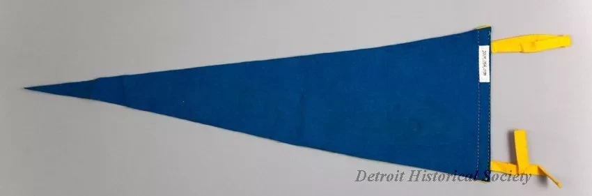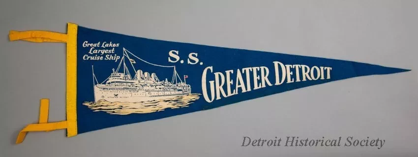 One S.S. GREATER DETROIT souvenir pennant made of felt. The design consists of a white and pale yellow profile view of the ship which is printed on a triangular-shaped piece of blue felt along with white lettering that reads "S.S. Greater Detroit." The hoist side of the pennant has been reinforced with a strip of yellow felt. Also, two pairs of short strips of yellow felt are sewn on the hoist side to allow for attachment to a line or to hooks. The back side of the pennant has no design.