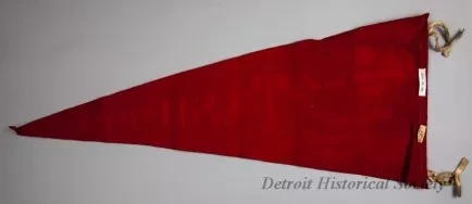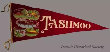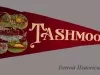 One "Tashmoo" souvenir pennant made of red felt. The triangular pennant has five multi-color printed images on the left side that show the excursion steamer, SS TASHMOO, and scenes of Tashmoo Park. Large white printed text on the right side of the pennant reads "Tashmoo. A white felt stripe is sewn along the hoist edge of the pennant with two pairs of short strips of white felt sewn near the corners to allow for attachment to a line or to hooks. The back does not have a design, and a small paper label has printed text that reads "Made By A. W. Hanington & Co., 161 & 163 Grand St., New York," and "New Process, Patent Applied ---."