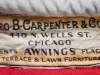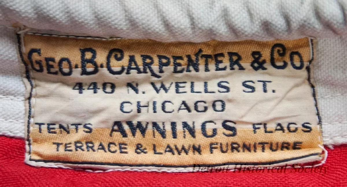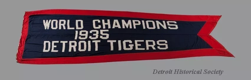 One World Champions baseball pennant won by the Detroit Tigers in 1935. The large triangular swallowtail pennant is made of heavyweight red/blue/white cotton fabric. The center field is dark blue with a red band sewn along the perimeter. White fabric letters, 28-inch high, are sewn across the blue field and read "World Champions, 1935, Detroit Tigers." The hoist edge is reinforced with white canvas tape and includes a length of rope that is sewn inside the tape. Small loops are located at each end of the rope for attachment to a flagpole halyard. A manufacturer's label on the hoist edge reads "Geo. B. Carpenter & Co., 440 N. Wells St., Chicago," and "Tents, Awnings, Flags, Terrace & Lawn Furniture."