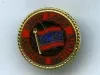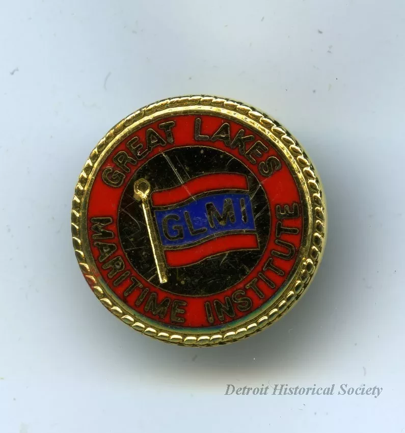 One brass lapel pin of the "Great Lakes Maritime Institute." The circular-shaped pin has a gold-colored background with decorative rope edge as well as a red and blue flag at the center that has the letters, "GLMI." The name of the institute is shown in gold-colored text along the perimeter. The back has a pin and pinch spring fastener.