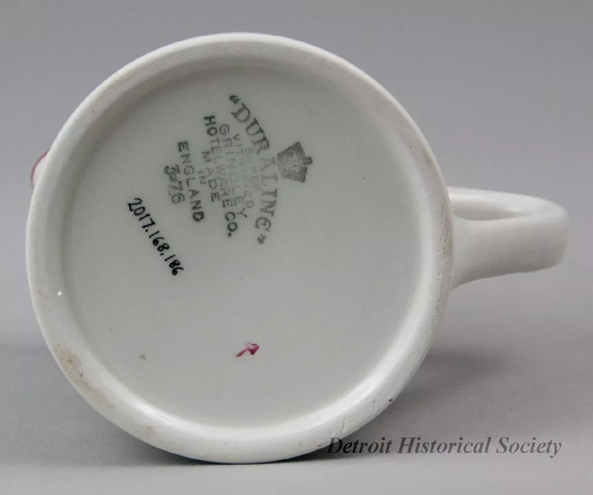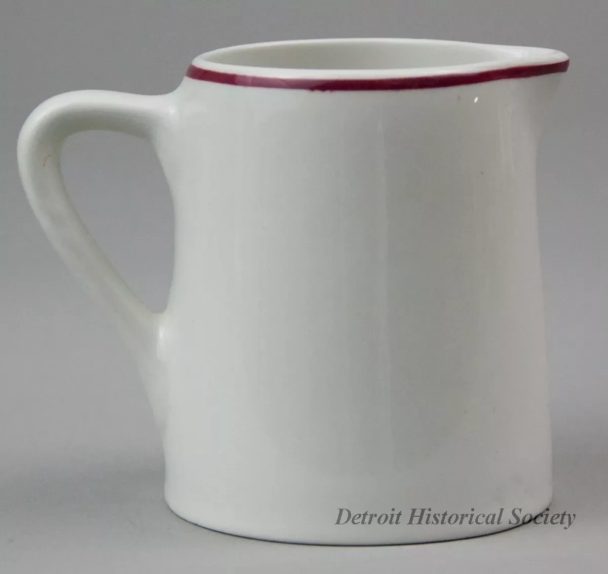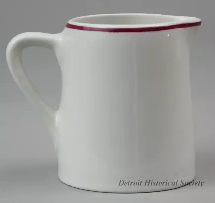 One cream pitcher from a dining room of one of the steamships of the Algoma Central Railway fleet. The pitcher is made of heavyweight, white glazed china. It has an open top with a small spout, an inward-rounded top edge, and a plain curved handle with a flat thumb rest. The straight sides flare outward slightly to form a wide circular base. A narrow red stripe encircles the pitcher along the top edge. A red/white/black image of the "Algoma Central Railway" company flag is stamped on one of the sides beneath the red stripe. The underside is stamped with a small crown logo and black text that reads "Duraline Super Vitrified, Grindley Hotelware Co.," and "Made in England, 3-76."