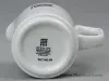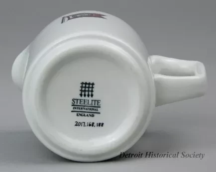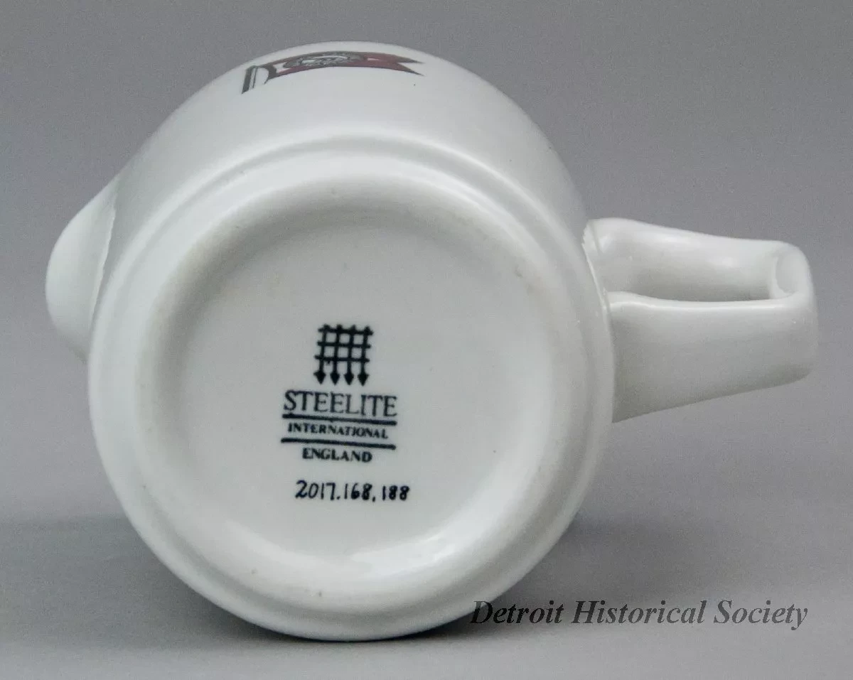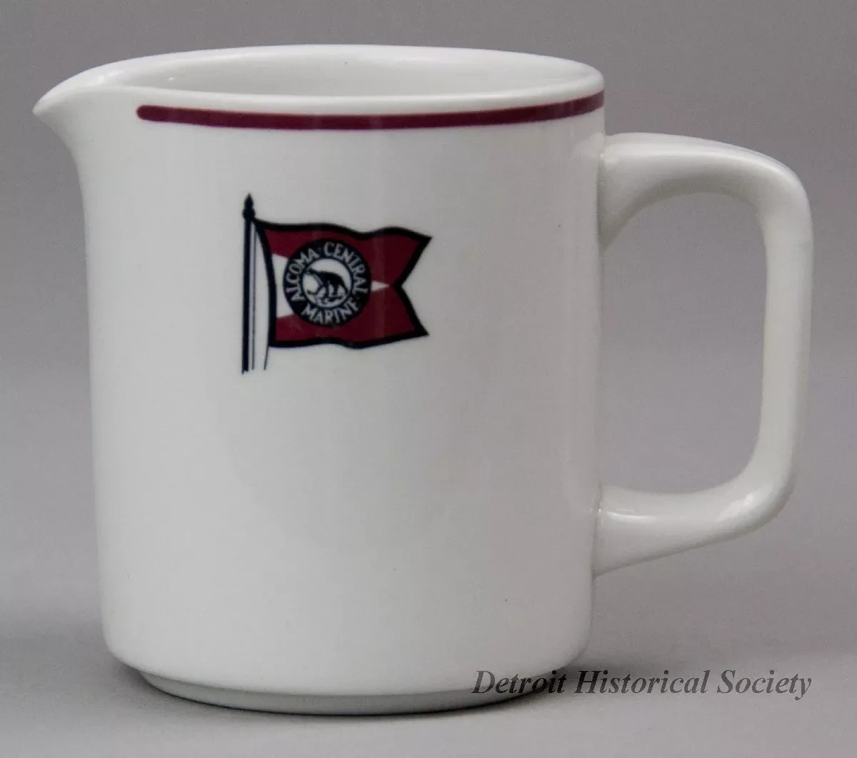One cream pitcher from a dining room of one of the steamships of the Algoma Central Railway fleet. The cylindrically-shaped pitcher is made of heavyweight, white glazed china. It has an open top with a small spout, a rounded top edge, and a plain rectangular handle with a flat thumb rest. Except at the spout, a narrow red stripe encircles the pitcher along the top edge. A red/white/black image of the "Algoma Central Marine" company flag is stamped on one of the sides beneath the red stripe. The underside is stamped with a small portcullis grate logo and black text that reads "Steelite International, England."