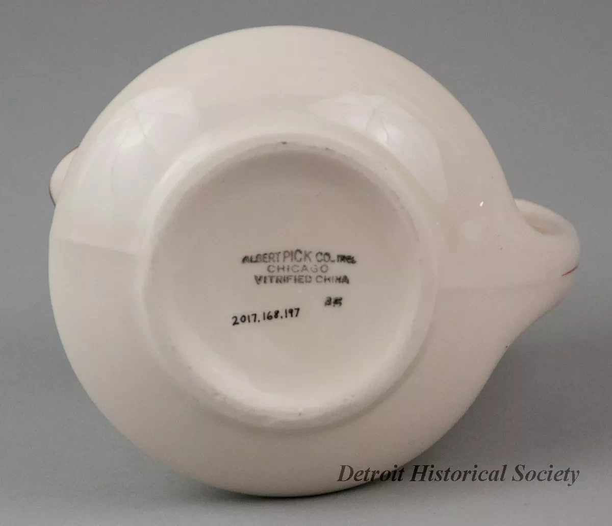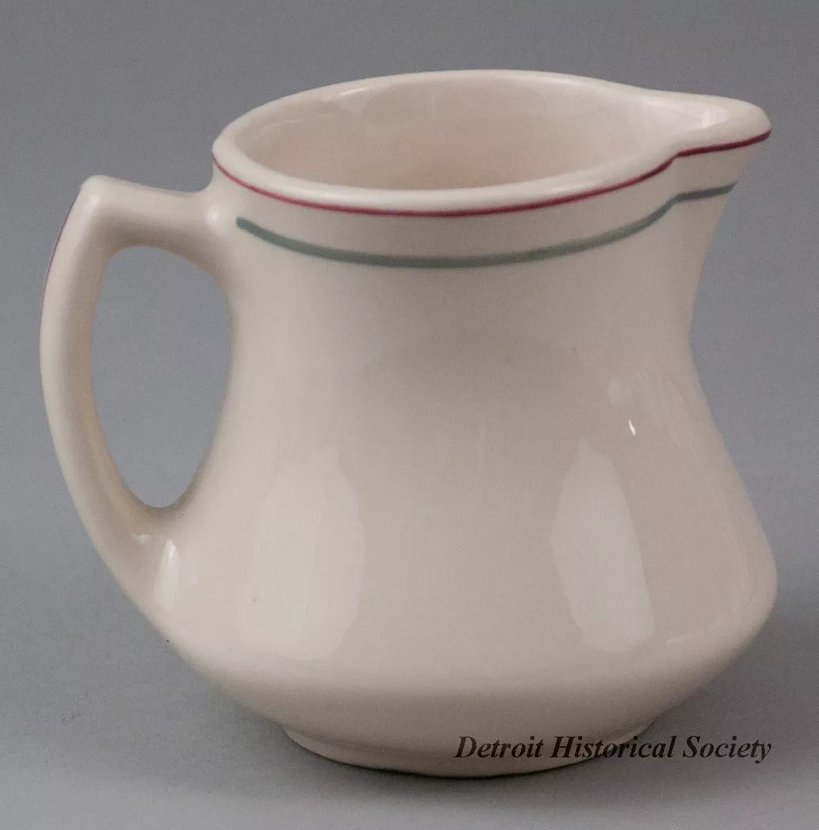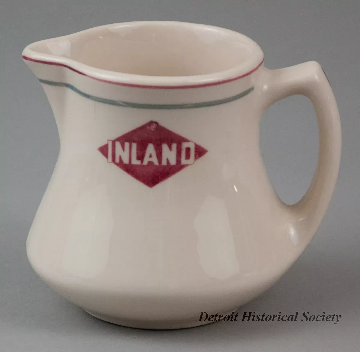 One small cream pitcher from the dining room of the bulk carrier, Philip D. Block, of the Inland Steel Company. The pitcher is made of heavyweight, glazed china of a bone/ivory color. It has an open top with a short spout, a rounded top edge, and a tall curved handle that has a flat thumb rest and a narrow red stripe on the outside. It has curved sides that flare outward to form a rounded bottom with a flat circular base. A narrow red stripe encircles the outside top edge of the rim and a narrow gray stripe is located about 3/8" beneath it. A red diamond-shaped company emblem, which shows the name, "Inland," in bone/ivory-colored text, is stamped below the stripes on one side of the pitcher. The underside is stamped with black text that reads "Albert Pick Co., Inc., Chicago," and "Vitrified China, 35."