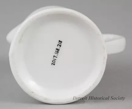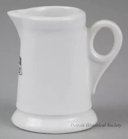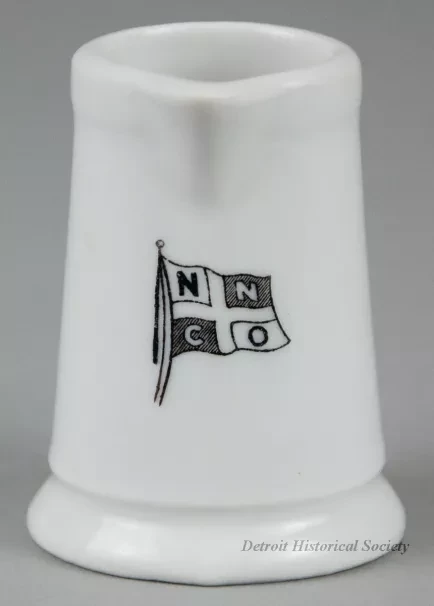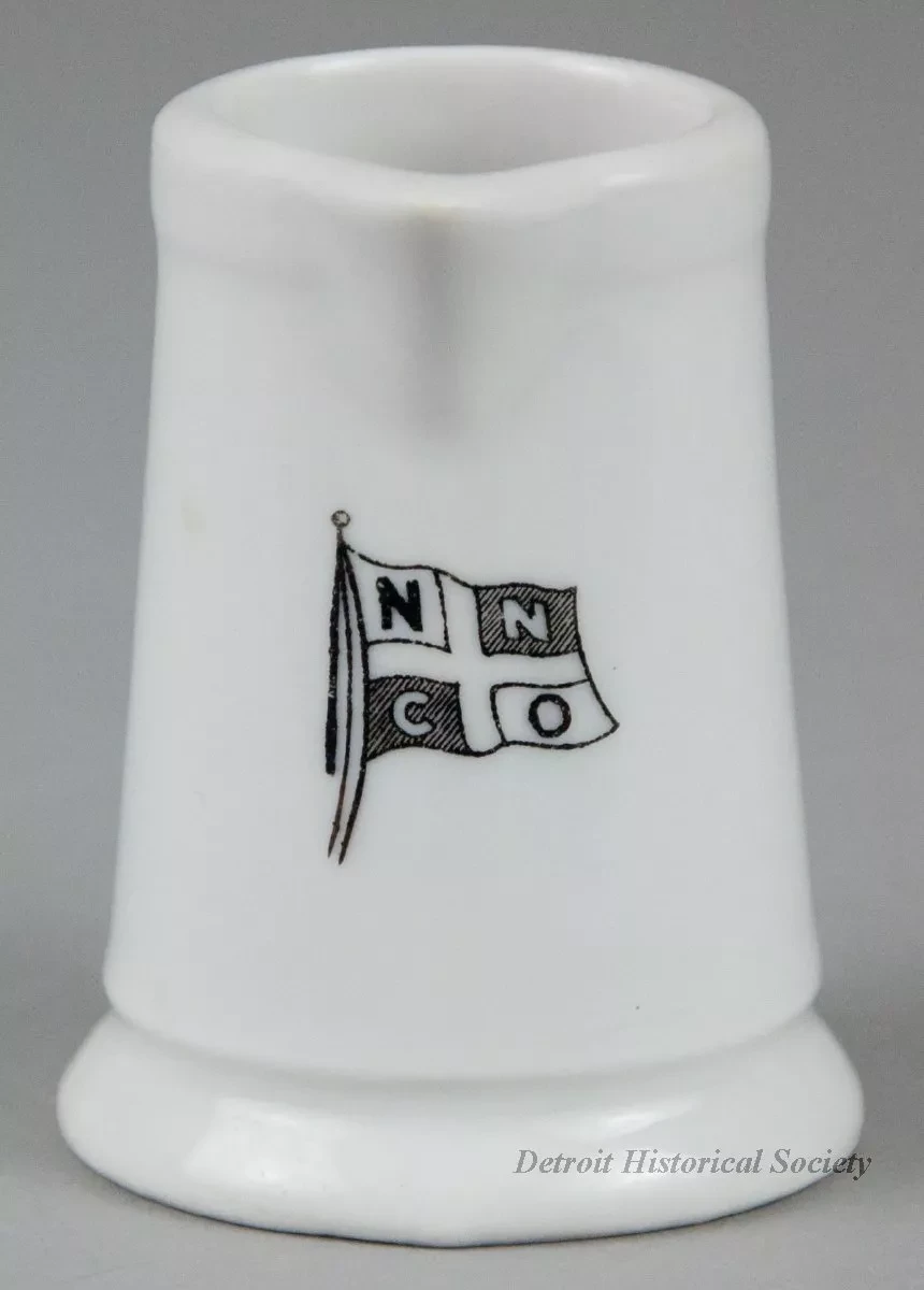 One small cream pitcher (single serving size) from the dining room of the passenger steamship, SS City of Collingwood, of the Northern Navigation Company. The cylindrically-shaped pitcher is made of heavyweight white glazed china. It has an open top with a thickened rim, a short spout, straight sides that flare outward slightly to form a wider base with a rounded edge, and a plain curved side handle. A black and white image of the company flag is stamped the side of the pitcher beneath the spout. No manufacturer's name or marks are shown.