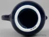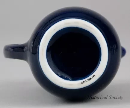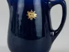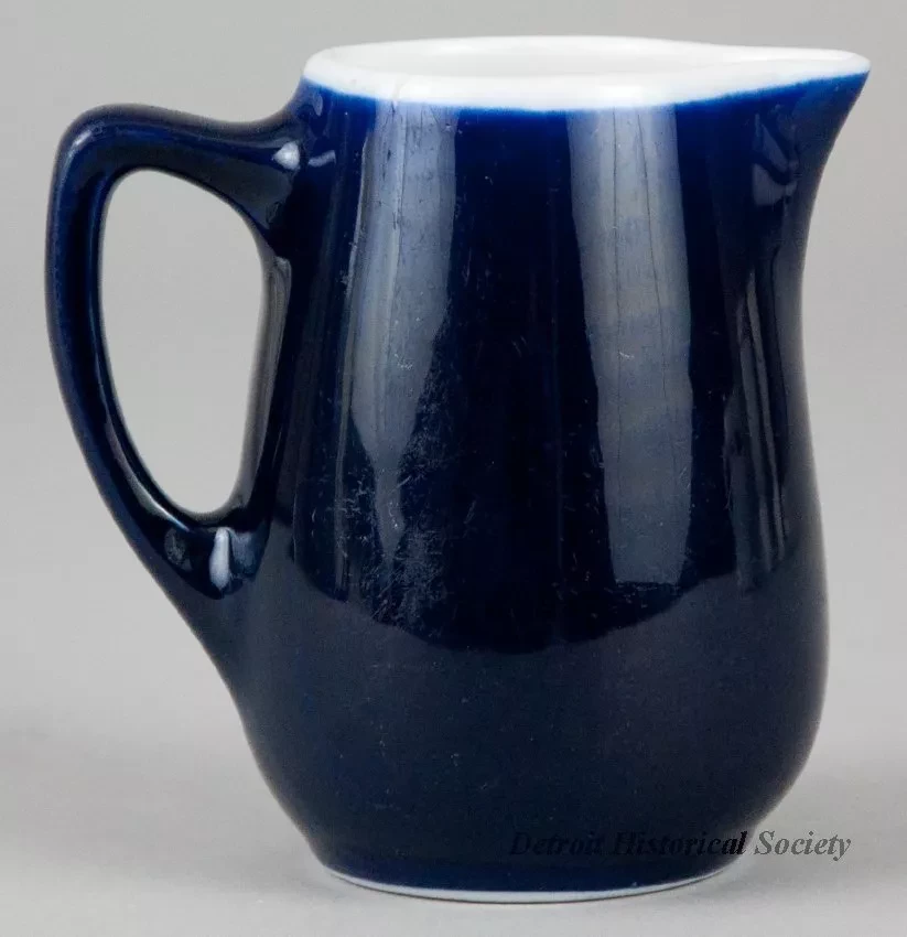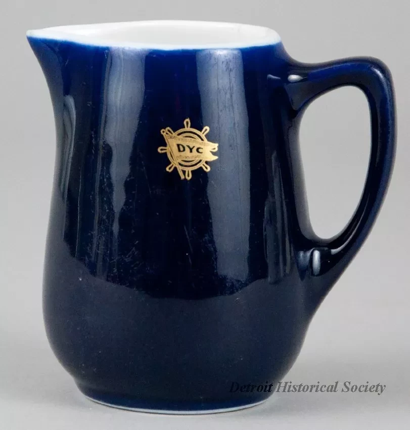 One cream pitcher from the dining room of the Detroit Yacht Club (DYC). The pitcher is made of heavyweight, white glazed china with a dark blue exterior. It has an open top with a slightly curved spout, a rounded top edge, and a tall curved handle on the side that has a flat thumb rest. The gently-curved sides flare outward to form a rounded bottom with a short circular base. A gold-colored logo, consisting of a ship's wheel and DYC burgee, is stamped on one side of the pitcher. No manufacturer's name or marks are shown.