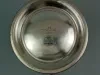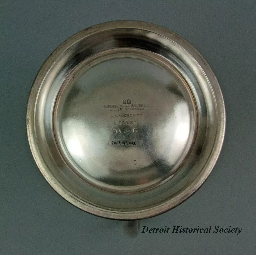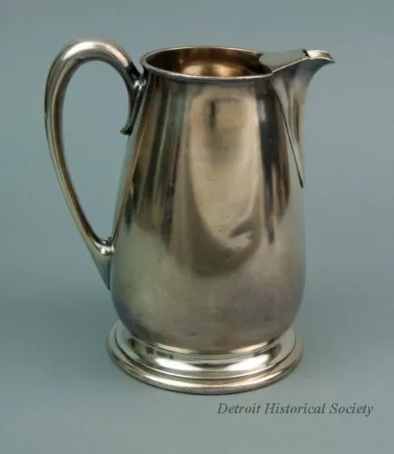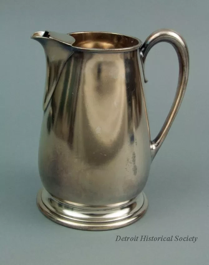 One silverplate water pitcher from the 13th floor dining room at Hudson's downtown Detroit store. The pitcher has a simple circular Revere style base with wide rounded sides which taper to a slightly narrower diameter open top. A large curved handle is located on one side of the pitcher and a small, gently curved spout is formed at the narrow, rounded top rim on the opposite side. Stamped text on the underside of the base reads "IS, International Silver Co., Silver Soldered" and "J.L. Hudson Co., SF0227, 64 Oz., 53."