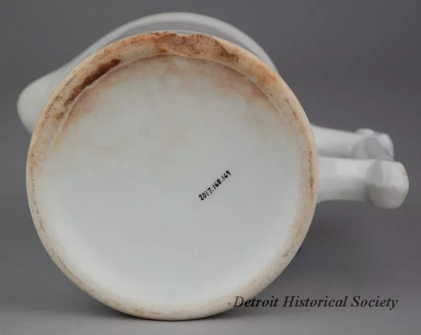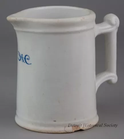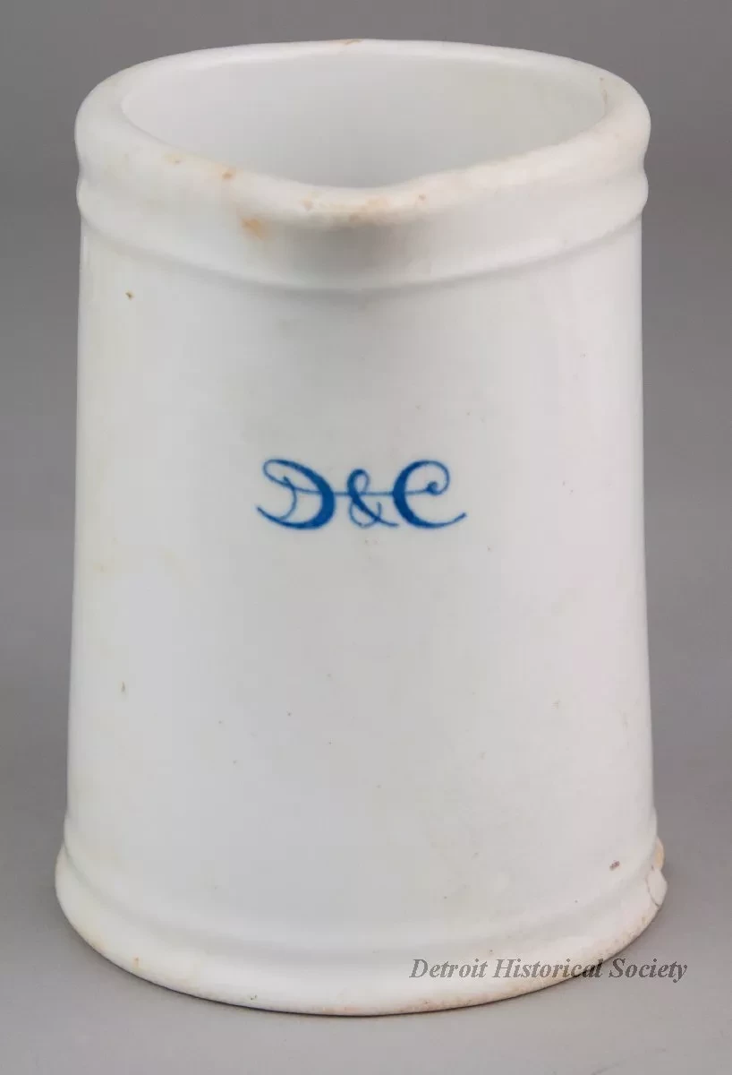 One water pitcher from the dining room of the passenger steamship, SS Greater Detroit, of the Detroit & Cleveland Navigation Company. The pitcher is made of heavyweight white glazed china. It is has an open top with a wide spout, a round body with straight sides that flare outward slightly to form a wider base, and a decorative rectangular handle with a thumb rest. The pitcher is plainly-decorated with some scrollwork on the handle and faint ridge lines that encircle the outside near the rim and base. The blue script "D&C" logo is stamped on the side below the spout. No manufacturer's name or marks are shown.