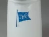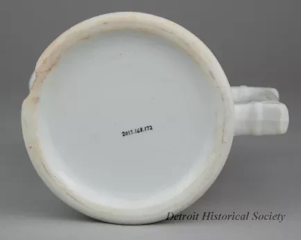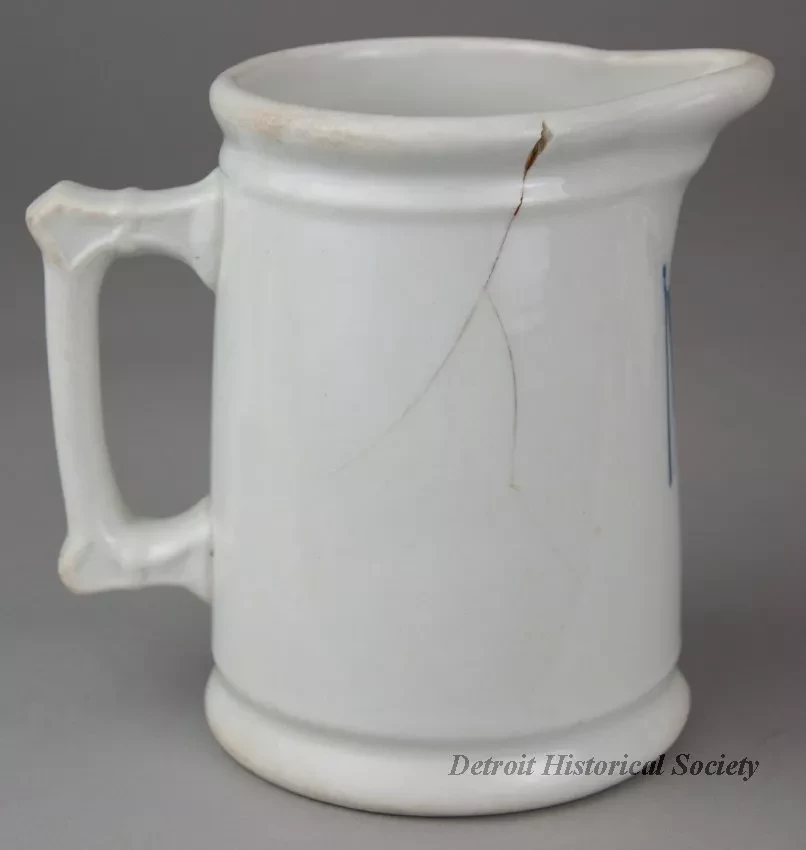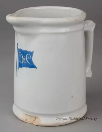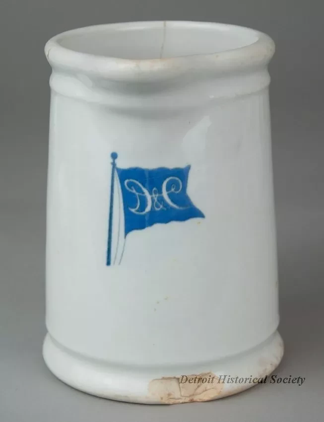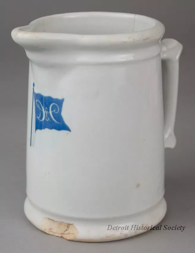 One water pitcher from the dining room of the passenger steamship, SS City of Detroit, of the Detroit & Cleveland Navigation Company. The pitcher is made of heavyweight white glazed china. It is has an open top with a wide spout, a round body with straight sides that flare outward slightly to form a wider base, and a decorative rectangular handle with a thumb rest. The pitcher is plainly-decorated with some scrollwork on the handle and faint ridge lines that encircle the outside near the rim and base. A blue/white image of the "D&C" company flag is stamped on the side below the spout. No manufacturer's name or marks are shown.
