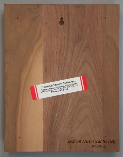 One commemorative plaque from the International Freedom Festival committee. The rectangular plaque is made of walnut wood that has wide beveled edges. A brass plate with a decorative engraved border is affixed to the front of the plaque with four small screws (on at each corner) and has engraved text that reads "1980 Windsor-Detroit Freedom Festival, Tug Boat Race, Official Judge, Robert Zeleznik." The wood on the front of the plaque has been finished with a low-gloss lacquer. The back is unfinished and has a hole for hanging on a wall. An adhesive label has black printed text that reads "Universal Trophy Centre, Inc.; Trophies, Plaques, Engraving, Bowling Shirts; 1777 University Ave. W., Windsor, Ont. N9B 1C5, Phone 258-1113."