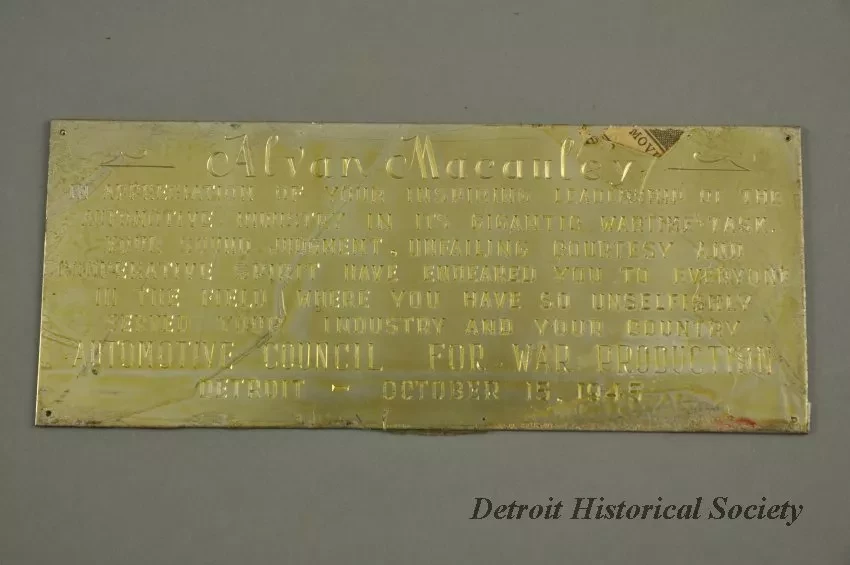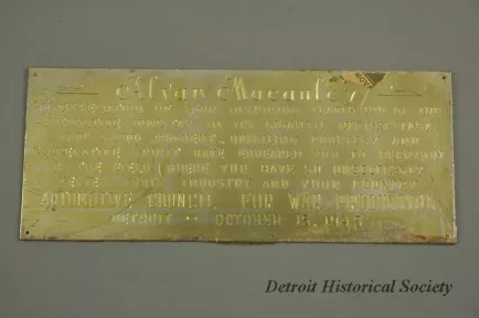 Brass palque presented to Packard Motor Car Company chairman of the board James Alvan Macauley, Sr. by the Automotive Council for Wartime Production. The plaque is inscribed with: