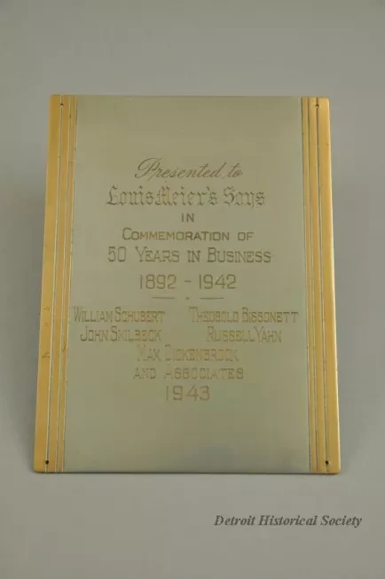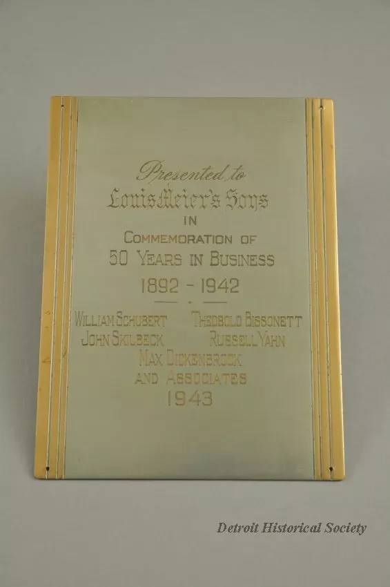 Presented to Louis Meier's sons in commemoration of 50 years in business 1892-1942.