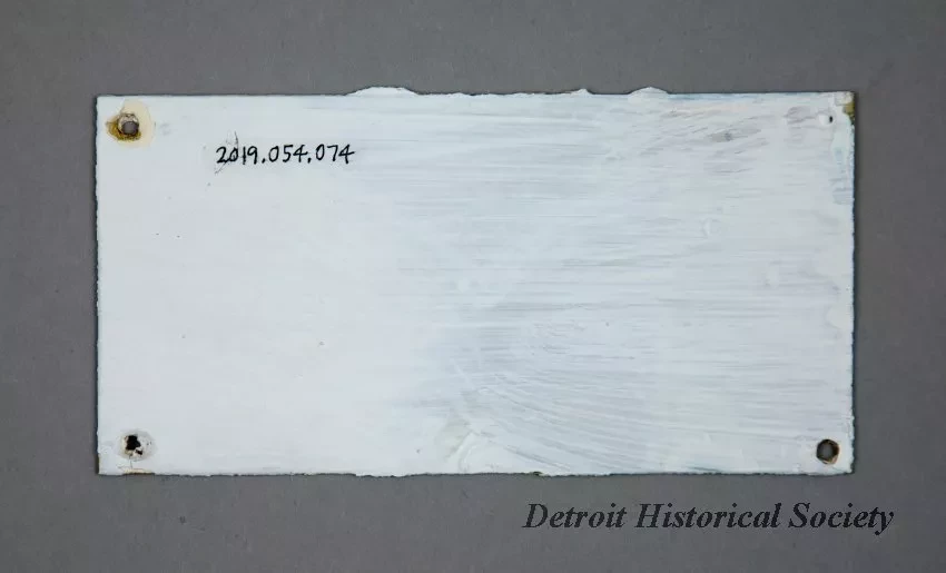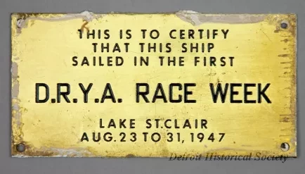 One small "D.R.Y.A. [Detroit River Yachting Association] Race Week" award plaque. The plaque is made rectangular sheet brass which has engraved black text on the front that reads "This Is To Certify That This Ship Sailed In The First D.R.Y.A. Race Week, Lake St. Clair, Aug. 23 to 31, 1947." The plaque has small screw holes at each corner for mounting on a bulkhead or other flat surface.