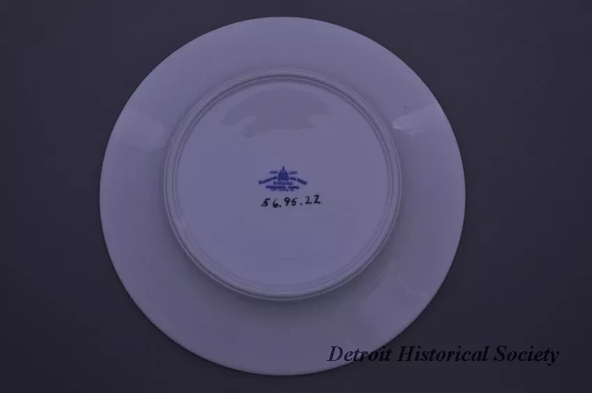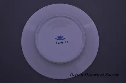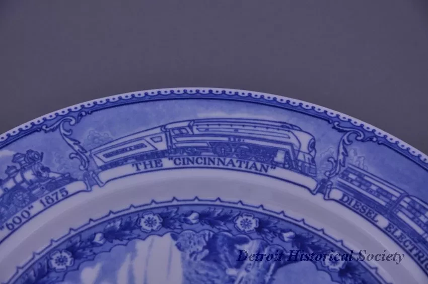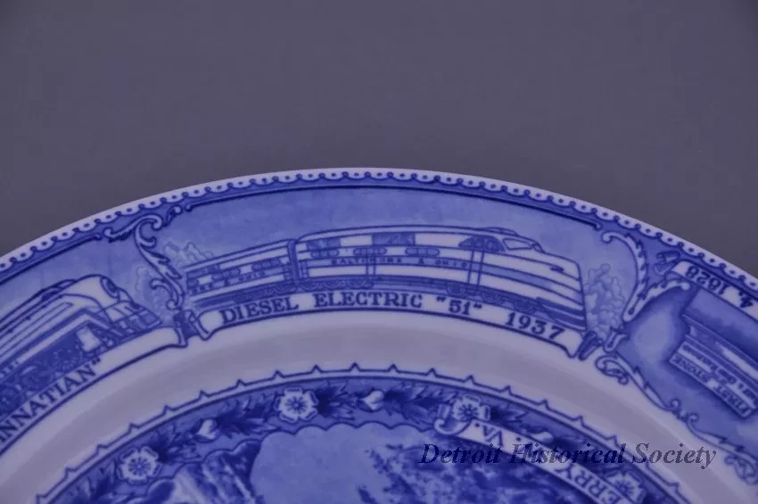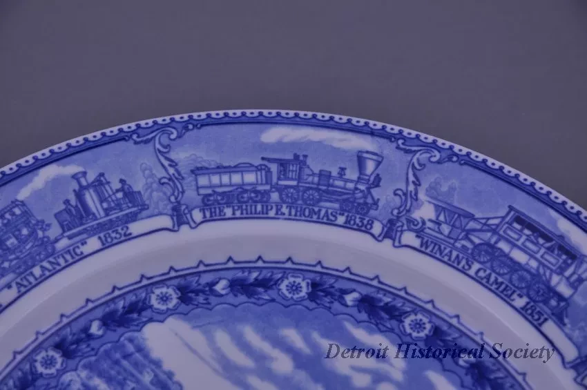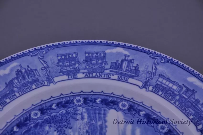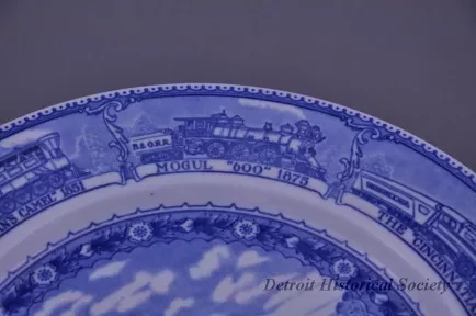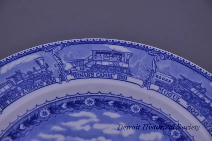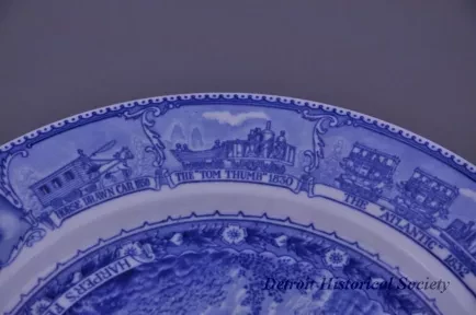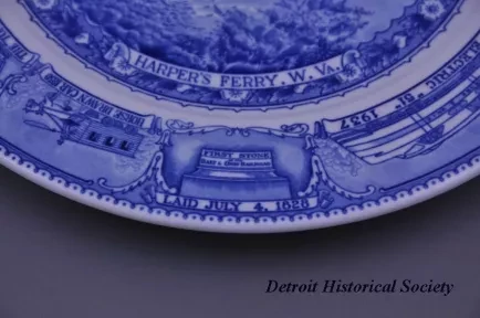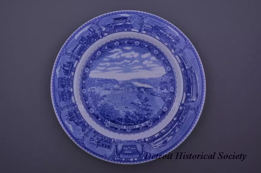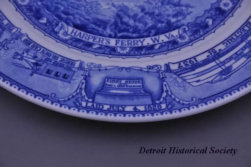 China Plate. A standard size dinner plate of blue on white china features various locomotives of the Baltimore and Ohio Railways, as well as a landscape portrait of Harper's Ferry, West Virginia, as identified in a banner at the bottom of the image. The central focus of the landscape is a bridge running over the Potomac River, with a pair of buildings on the right bank, and more smaller structures on the left. Foliage decorates the foreground at the bottom of the image and clouds grace the top. Enclosing the face of the plate is a flower and leaf band with scalloped ridges on the interior and a slight saw tooth pattern on the outer most edge. The design on the lip of the plate consists of transportation milestones and railroad locomotives. The bottom center panel depicts a pedestal marked "First Stone Balt. and Ohio Railroad," while a banner below reads, "Laid July 4, 1828." This is the only image that faces outward; all other images face inward toward the central landscape. Moving clockwise, the following panels depict a "Horse Drawn Car 1830," "The 'Tom Thumb' 1830," "The 'Atlantic' 1832," "The 'Philip E. Thomas' 1838," "'Winan's Camel' 1851," "Mogul '600' 1875," "The Cincinnatian," and the "Diesel Electric '51' 1937."