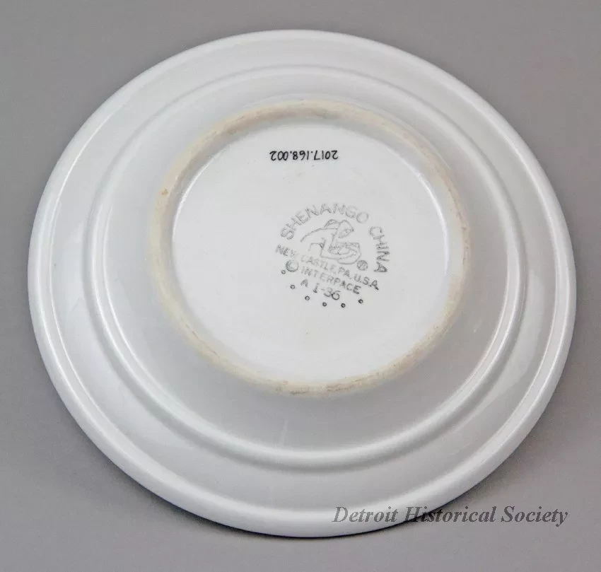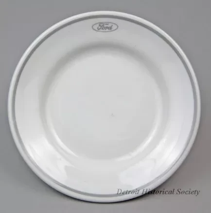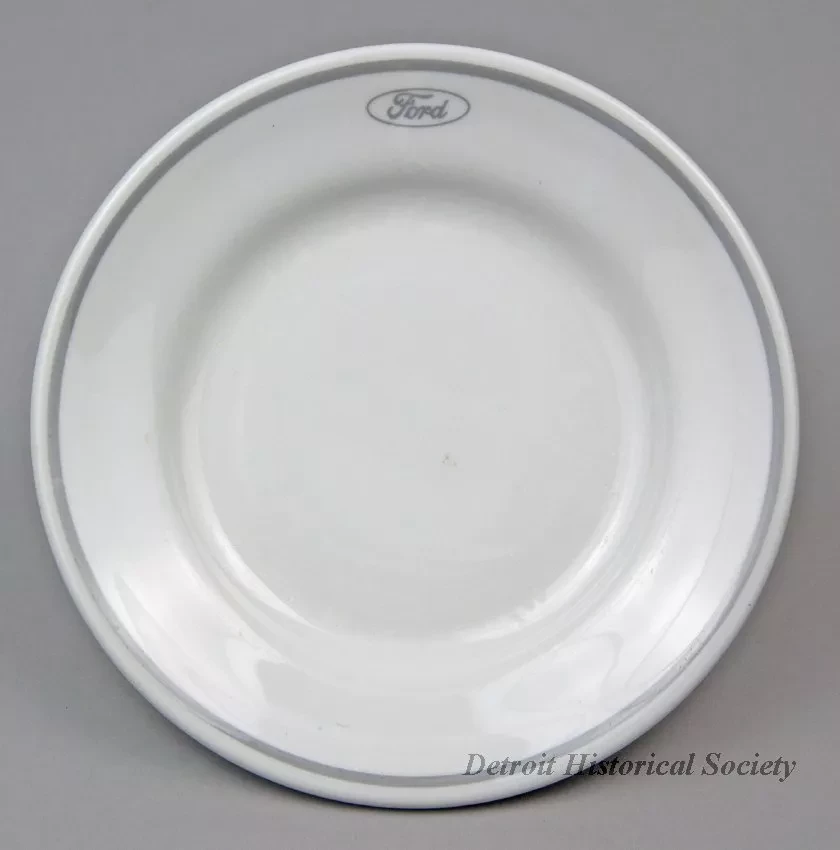 One bread or salad plate from the dining room of the SS John Dykstra of the Ford Motor Company steamship fleet. The round plate is made of heavyweight, off-white glazed china. It has a flat, upturned rim with a rounded edge and a narrow gray stripe. Just below the stripe, gray script text inside an oval shows the name, "Ford." The underside is stamped with black text that reads "Shenango China, New Castle, PA, U.S.A." and "Interface, A, I-36."