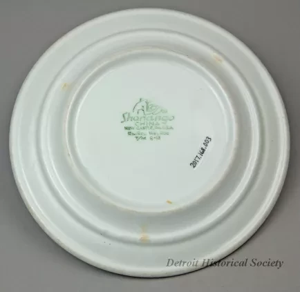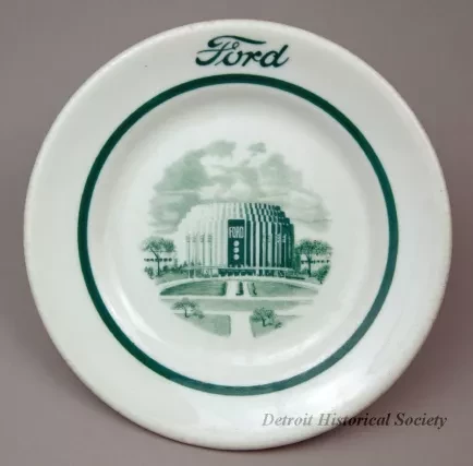 One bread or salad plate from the dining rooms of the Ford Motor Company steamship fleet. The round plate is made of heavyweight, off-white glazed china. It has a flat, upturned rim with a rounded outer edge and a narrow, dark green stripe along the inside edge. Just above the stripe, dark green script text shows the name, "Ford." A dark green engraved image of the Ford Rotunda is shown at the center of the plate. The underside is stamped with green text that reads "Shenango China, New Castle, PA, U.S.A." and "RimRol WelRoc, T/M R-13."