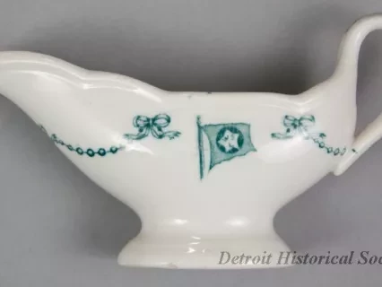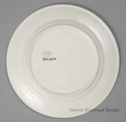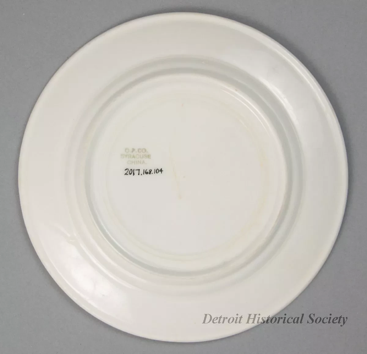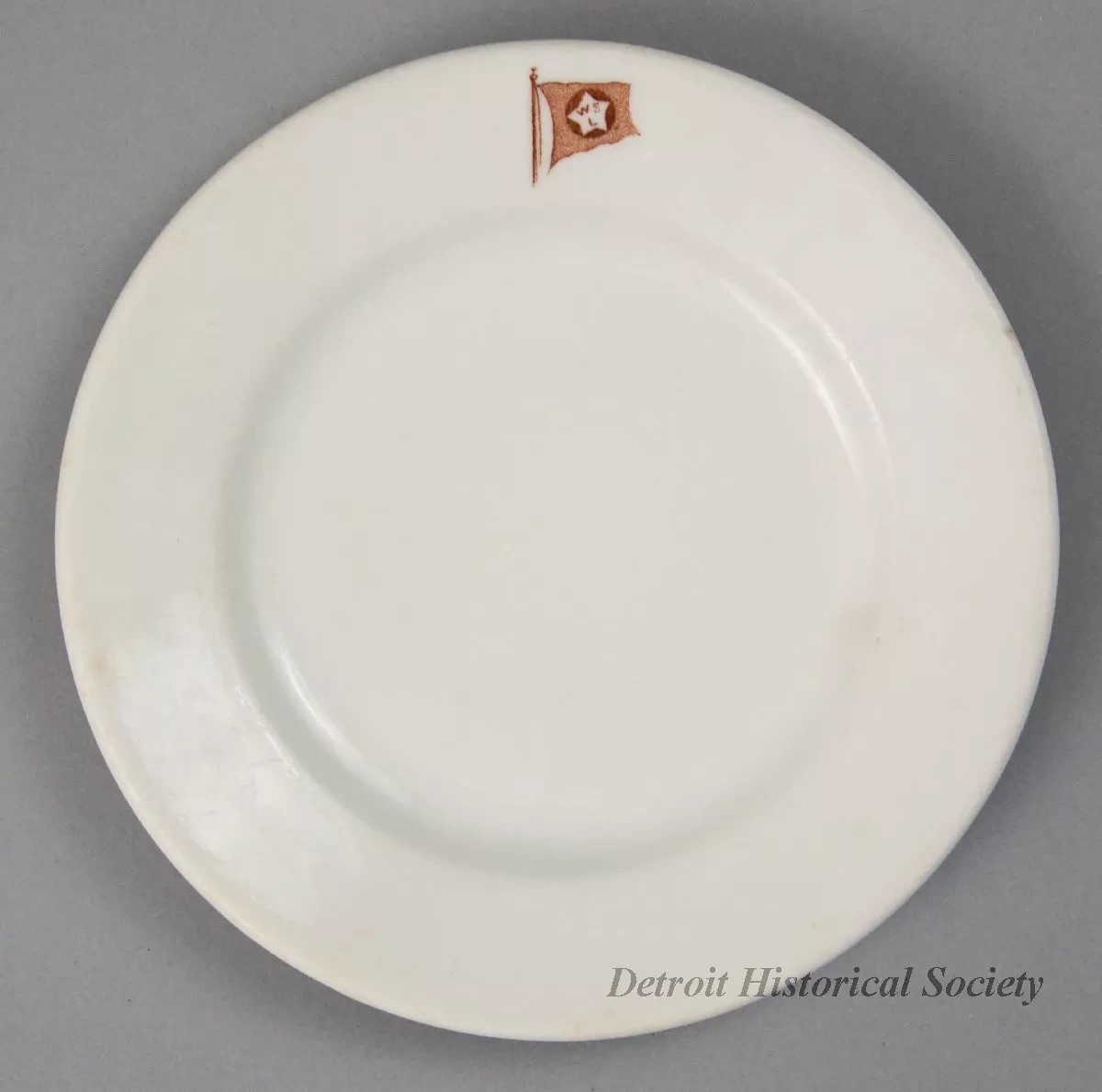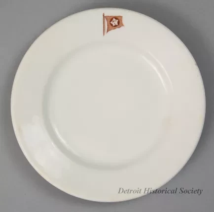 One bread plate from a passenger steamship dining room of the White Star Line. The round plate is made of heavyweight, white glazed china. It has a flat, upturned rim with a thickened outer edge. A red image of the company flag with the letters, "WSL," is stamped on the rim. The underside is stamped with green text that reads "O.P. Co. [Onondaga Pottery Company], Syracuse China."