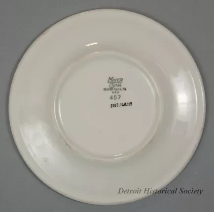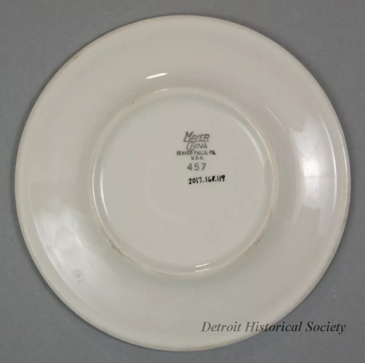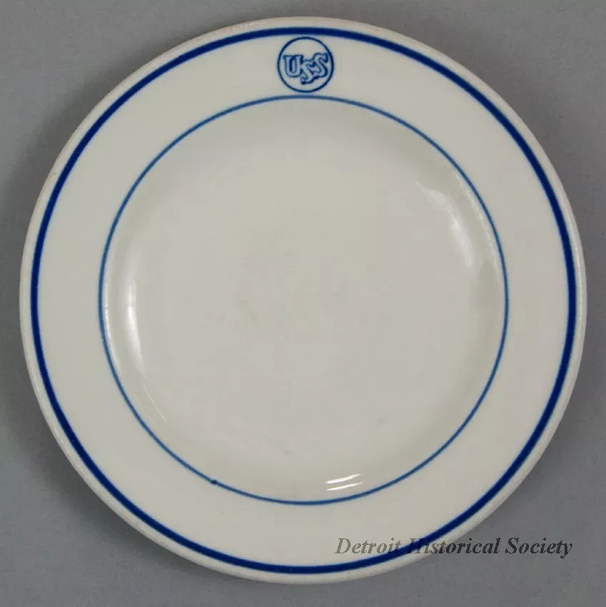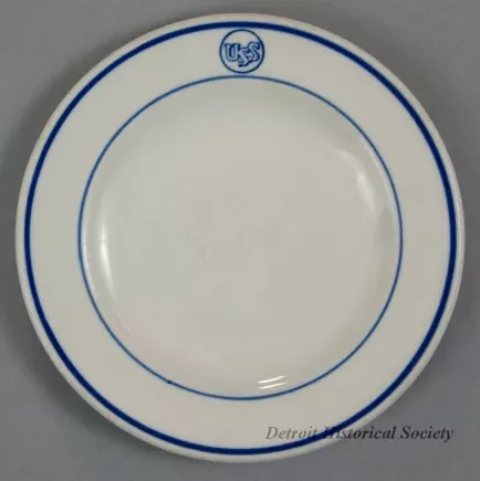 One bread plate from a dining room of one of the steamships of the United States Steel Corporation fleet. The round plate is made of heavyweight, white glazed china. It has a narrow, slightly upturned rim and a thickened outer edge. Narrow blue stripes encircle the rim along the outer and inner edges. The company logo, consisting of a blue circle with the letters, "USS," at the center, is stamped on one area of the rim between the stripes. The underside is stamped with black text that reads "Mayer China, Beaver Falls, PA, U.S.A.," and "457."