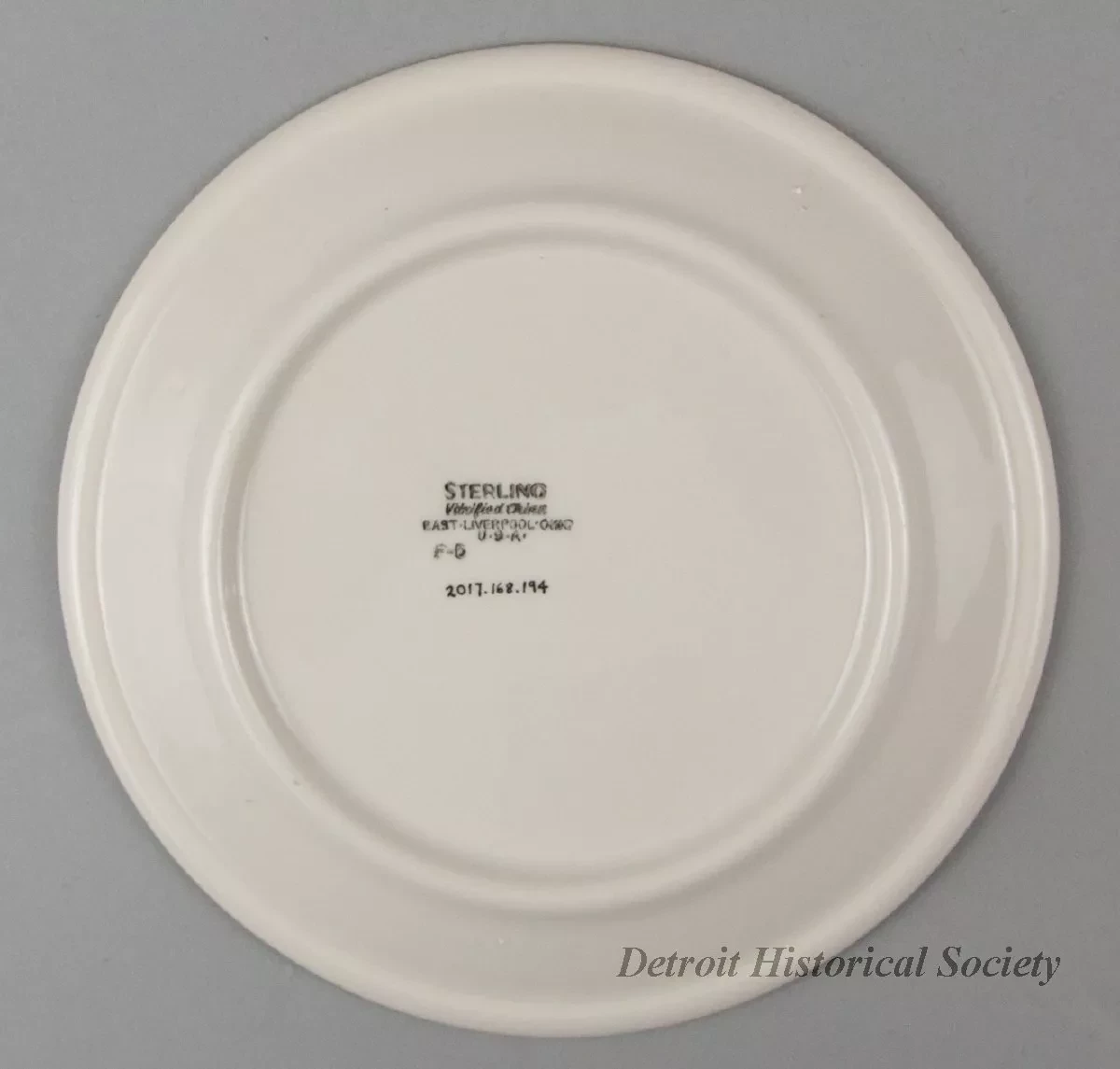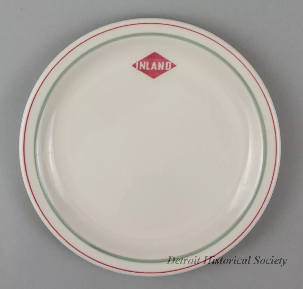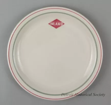 One bread plate from the dining room of the bulk carrier, SS Philip D. Block, of the Inland Steel Company. The round plate is made of heavyweight glazed china of a bone/ivory color. It has a narrow, slightly-upturned rim and a thickened outer edge. A narrow red stripe encircles the outer edge of the rim and a narrow gray stripe encircles the inner edge. A red diamond-shaped company emblem, which shows the name, "Inland," in bone/ivory-colored text, is stamped below the rim on one area of the plate. The underside is stamped with black text that reads "Sterling Vitrified China, East Liverpool, Ohio, U.S.A." and "F-5."