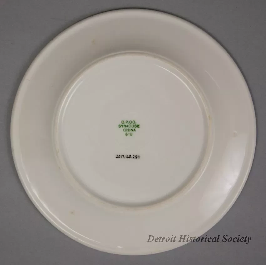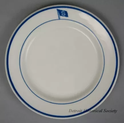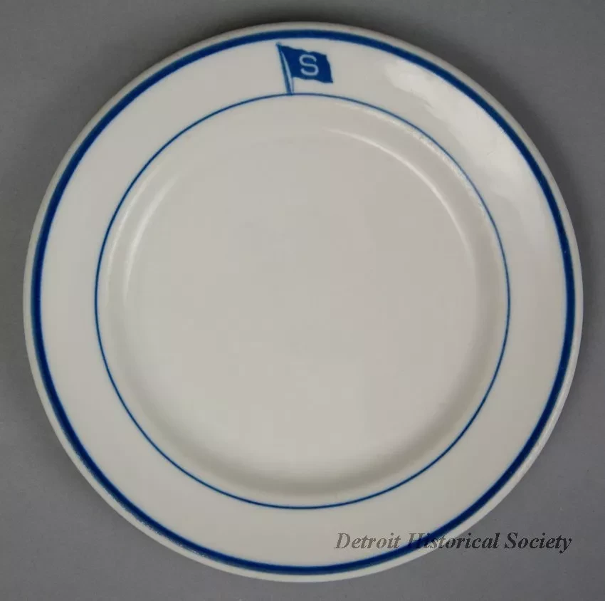 One bread plate from the dining room of the tanker, Renown, of the Standard Oil Company of Indiana. The round plate is made of heavyweight white glazed china. It has a flat, slightly-upturned rim and a thickened outer edge. Narrow blue stripes encircle the plate along the outer and inner edges of the rim. On one area of the rim between the stripes, a blue/white image of the company flag is shown. The underside is stamped with green text that reads "O.P. Co. [Onondaga Pottery Company], Syracuse China," and "6-U."