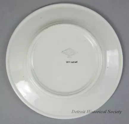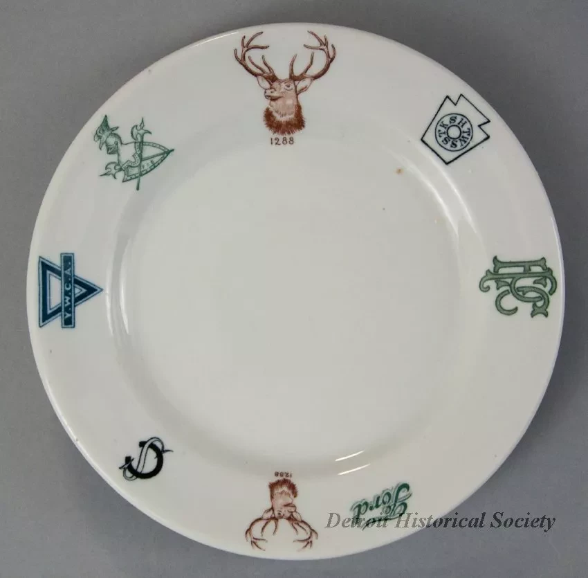 One sample/test plate (bread plate size). The round plate is made of white glazed china. It has a flat, slightly-upturned rim that is stamped with the multi-color logos/emblems of eight companies or organizations. Logos for Ford Motor Company and the Y.W.C.A. are shown as well as the Masonic emblem HTWSSTKS. The underside is stamped with a diamond-shaped logo and green text that reads "Vitrified, Avco China, Alliance, O [Ohio], U.S.A."
