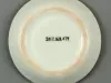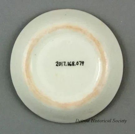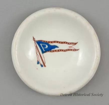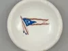 One small butter plate from the dining room of the bulk carrier, SS Rensselaer, of the Pittsburgh Steamship Company. The round plate is made of heavyweight, white glazed china. It has short curved sides with a rounded top edge. A red/white/blue image of the company burgee is stamped at the center of the plate. No manufacturer's name or marks are shown.
