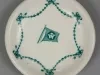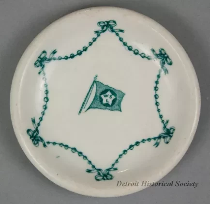 One small butter plate from the dining room of the passenger steamship, SS Tashmoo, of the White Star Line. The round plate is made of heavyweight, white glazed china. It has short curved sides with a rounded top edge. A small green bead and bow design is stamped on the top surface in a scalloped arrangement along the curved sides. A small green image of the company flag with the letters, "WSL," is stamped at the center of the plate. No manufacturer's name or marks are shown.