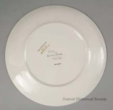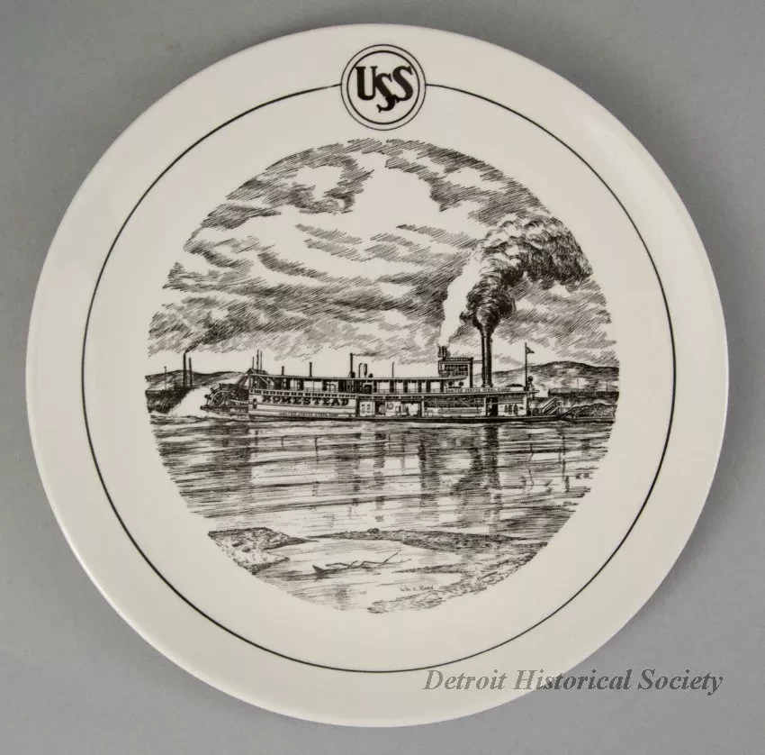 One commemorative plate that features the towboat, Homestead, of the United States Steel (USS) Corporation river fleet. The round plate is made of glazed white china plate and has a curved rim. A narrow black stripe encircles the plate along the midpoint of the rim and a circular "USS" logo is printed at the top. A large black and white, pen and ink style sketch is printed at the center of the plate and shows a starboard side view of the towboat which is underway on a river with a barge load of coal. Black printed text on the underside of the plate reads "Swing Ware" as well as "Ovenproof, Chip Resistant," and "Created by Wellsville China, Wellsville, Ohio." Additional gold-colored text reads "R-K Distributors, Box 285, Bewickley, PA."