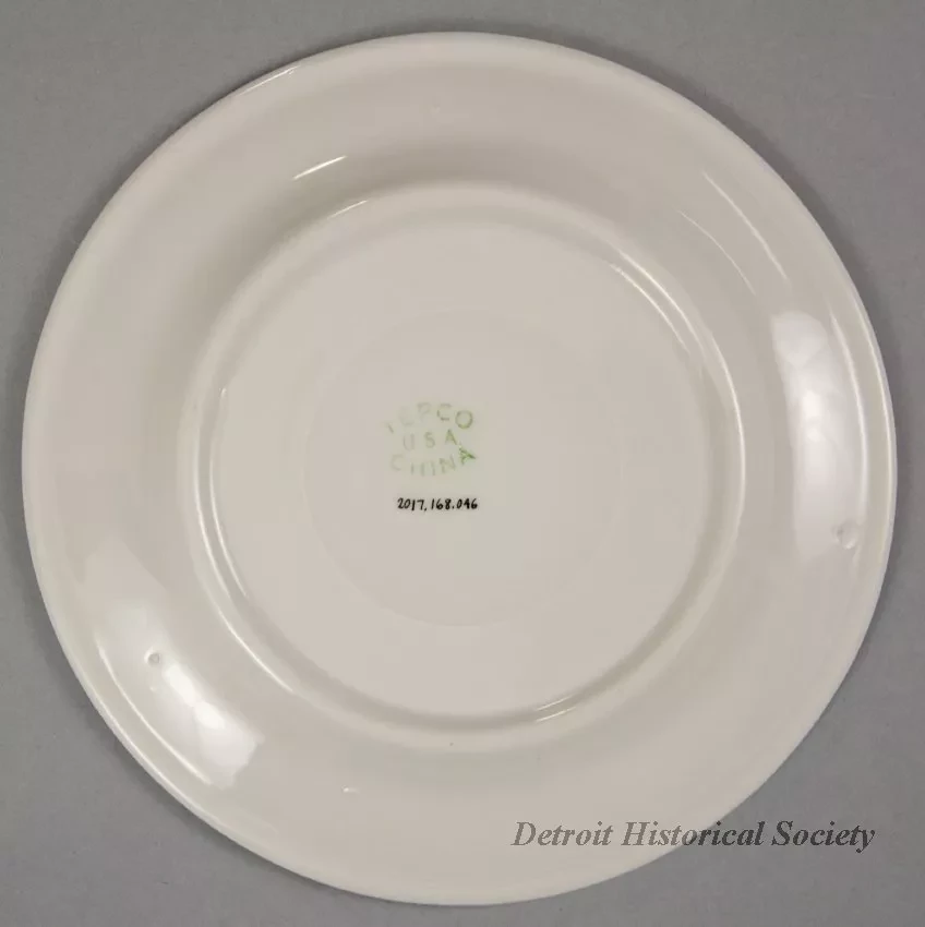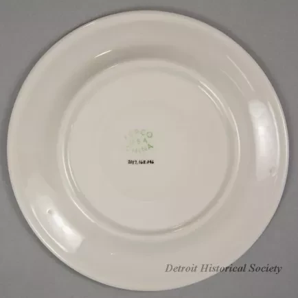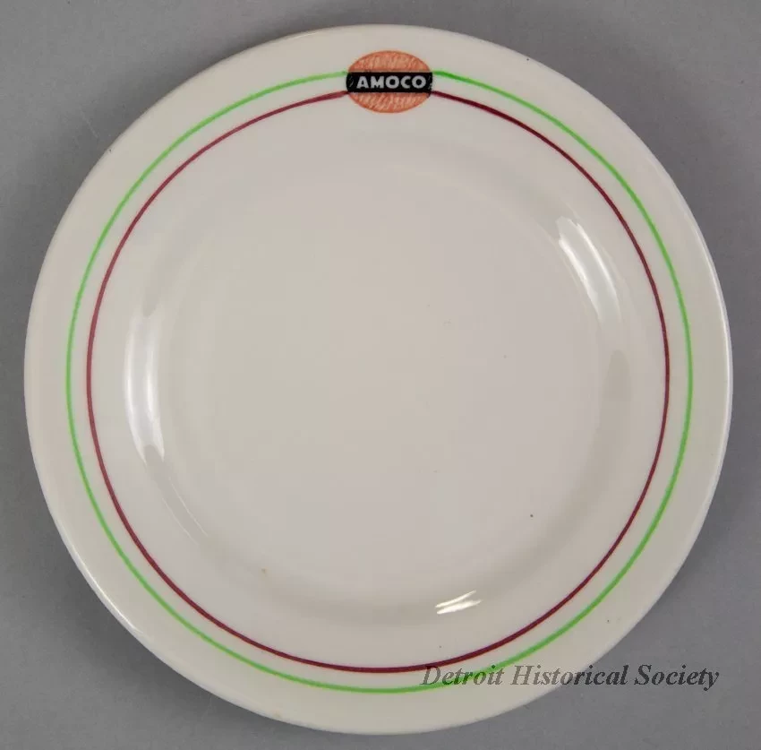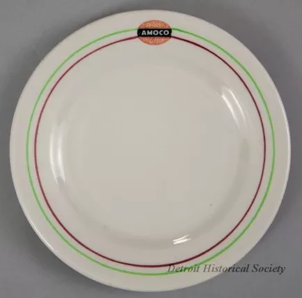 One dessert plate from a dining room of the Amoco Oil Company Great Lakes tanker fleet. The round plate is made of heavyweight glazed china in a light tan color. It has a flat, upturned rim with a thickened outer edge and narrow green and red stripes along the midpoint of the rim. At a break in the stripes, an oval-shaped, red/black company logo is stamped with lettering that reads "Amoco." The underside is stamped with green text that reads "Tepco China, U.S.A."